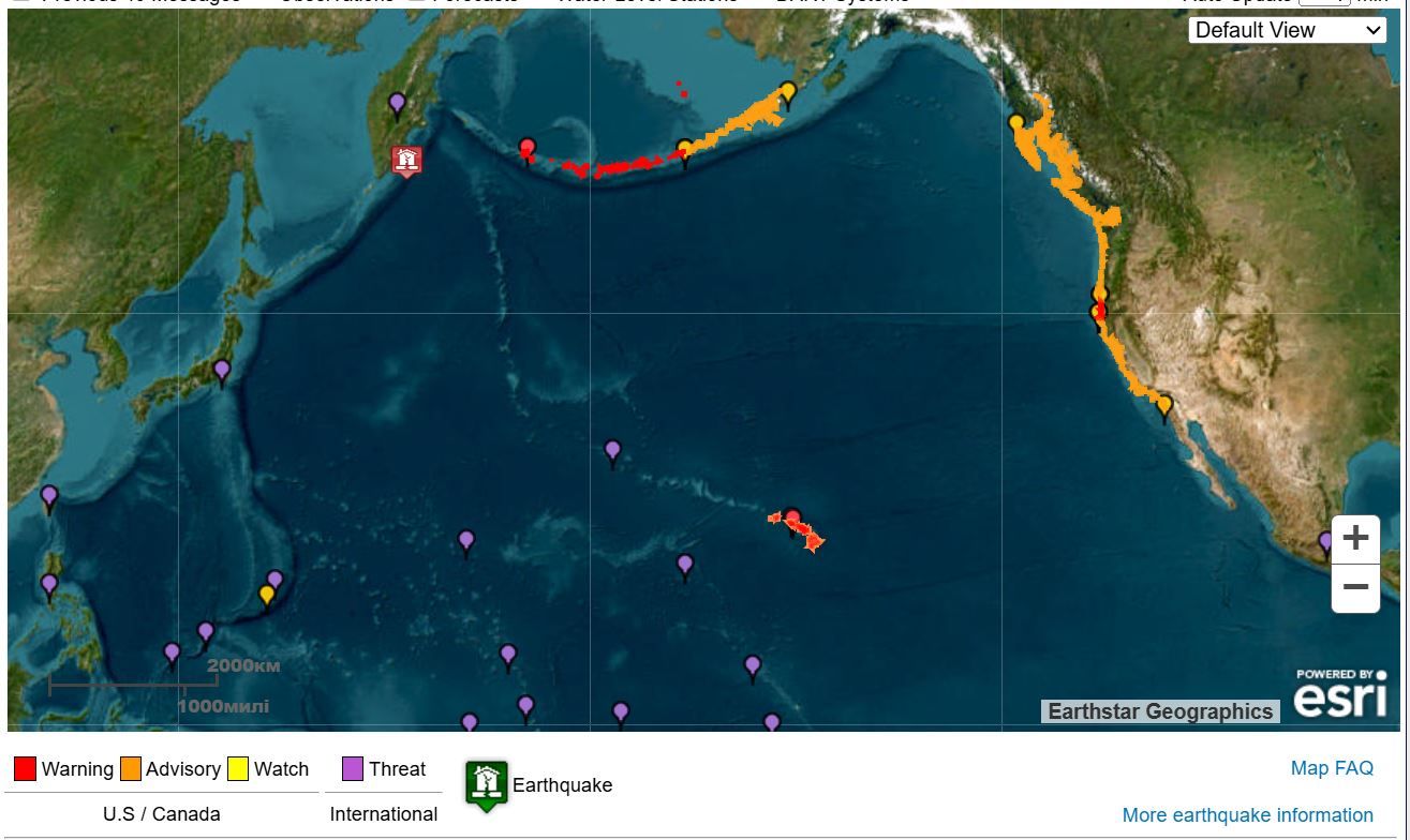 Попередження діє для Гавайських островів, острова Гуам, Американського Самоа, Аляски, Тихоокеанського узбережжя США та Японії. В останній попередження про цунамі змінили на загрозу цунамі.