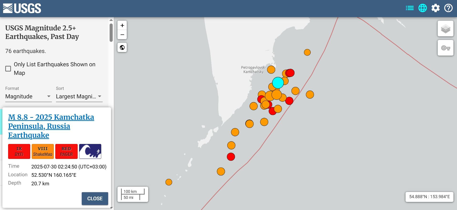 Геологічна служба США (USGS) про землетрус на Камчатці 30 липня / Скриншот 24 Каналу