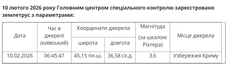 У вівторок, 10 лютого, поблизу узбережжя Кримського півострова зафіксували землетрус. Його магнітуда становила 3,6 за шкалою Ріхтера.