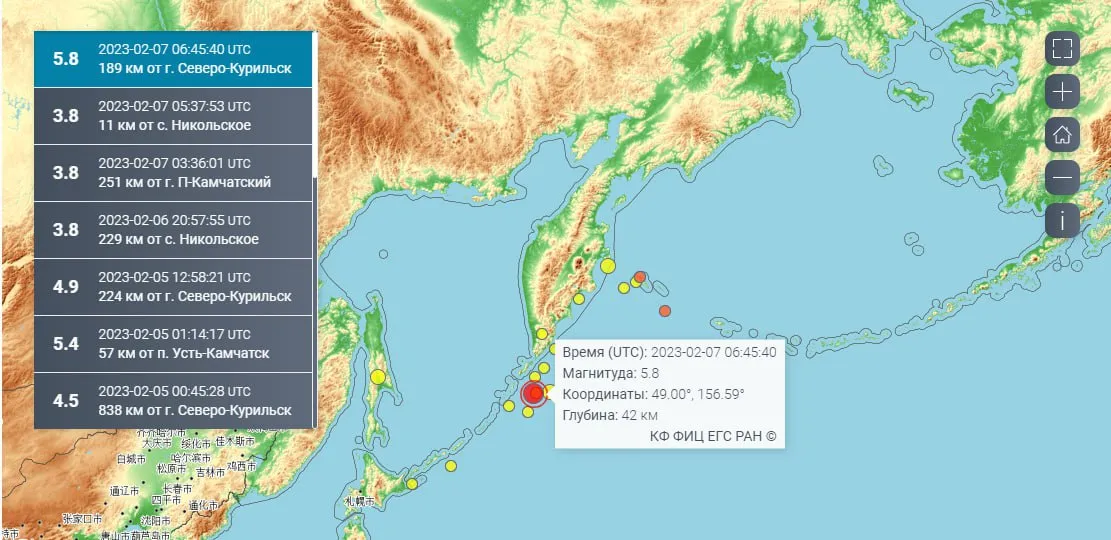 Як стало відомо, 7 лютого у Тихому океані біля Курильських островів зафіксували підземний поштовх магнітудою 5,8.