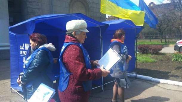 Нагадаємо, 25 квітня в Маріуполі з'явилися намети партії "Опозиційний блок". Біля них жінки в жилетках з написом "Опозиційний блок" і "За! Мир і розвиток" роздають листівки та збирають підписи під вимогою, в якій міститься низка норм.