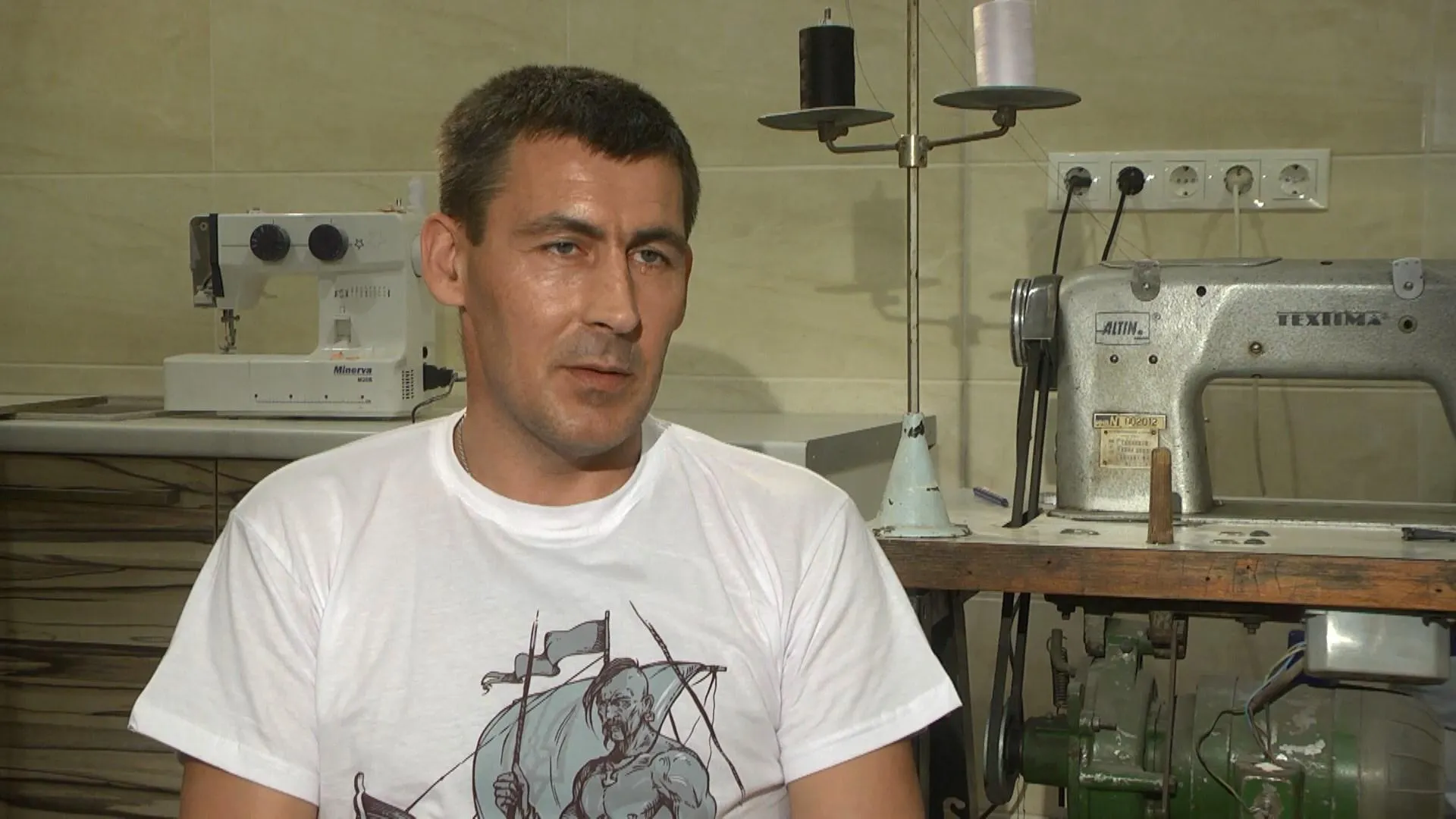 У міні-майстерні Олександра Овчаренка дві машинки і заготовлення для прапорів. Саме завдяки цьому чоловік став відомим серед побратимів та волонтерів. І вони ж допомагають ветерану підзаробити, він частково втратив слух після поранення на передовій. І травмував руку, тож аби відновитись почав шити.