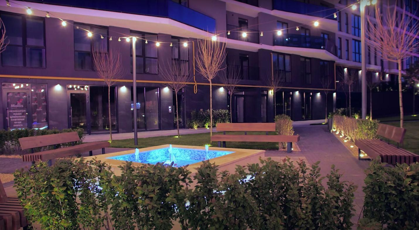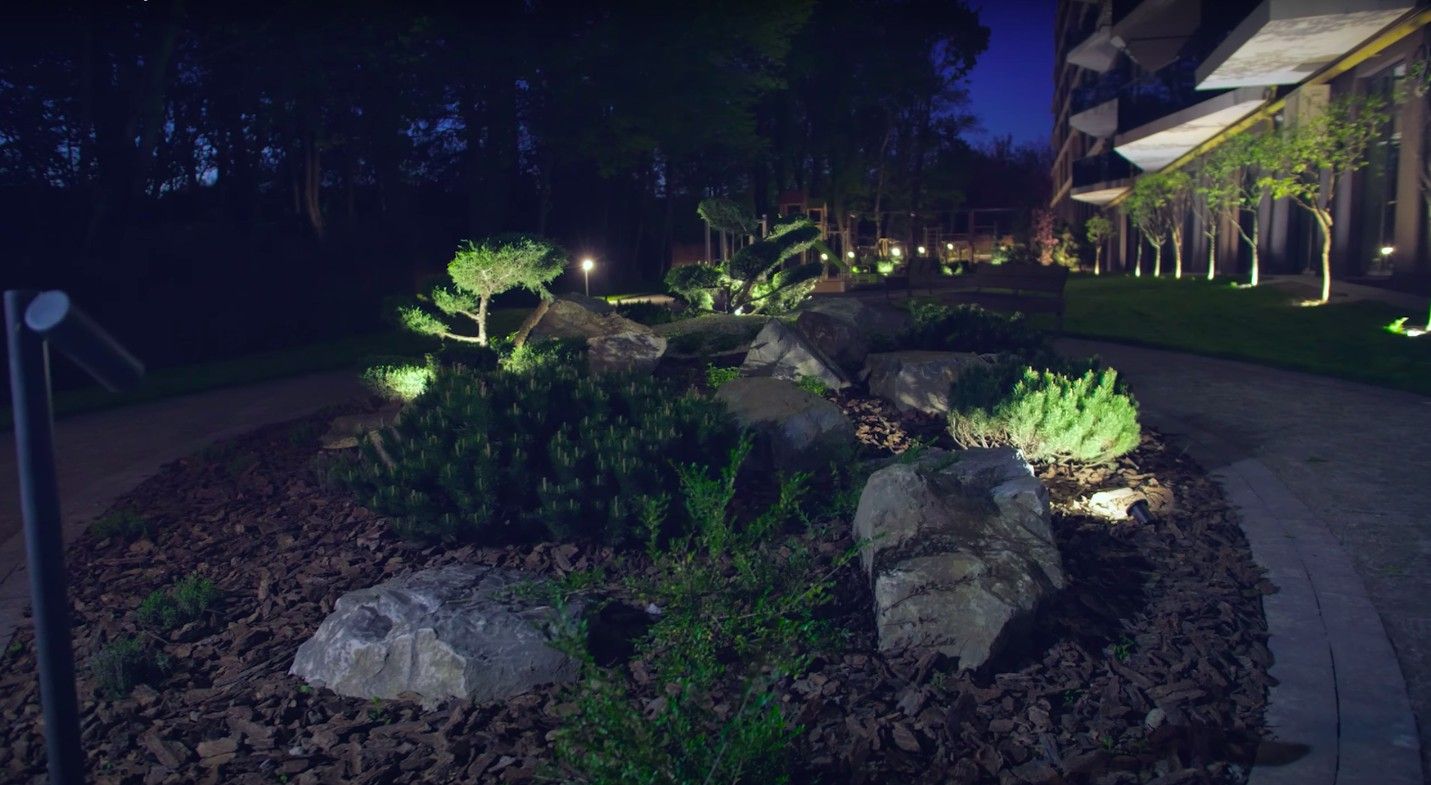 Атмосферу затишку та безтурботності на практично одному гектарі прибудинкової території створюють красивий фонтан, оазис з власним ботанічним садом, якісні вуличні меблі, стильний екстер'єр та дизайнерські під'їзди. Кожна деталь подвір'я ЖК розроблена найкращими ландшафтними дизайнерами.