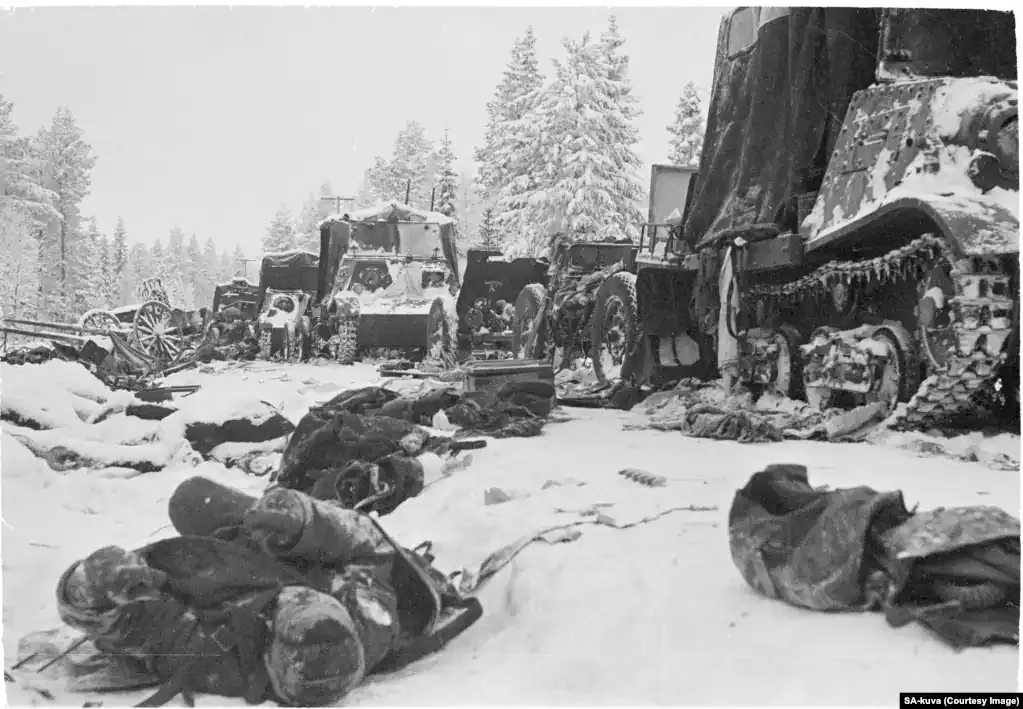 Тіла радянських військових після розгромного нападу на колону Червоної армії на Раатській дорозі, Зимова війна 1939/1940 / фото SA-kuva