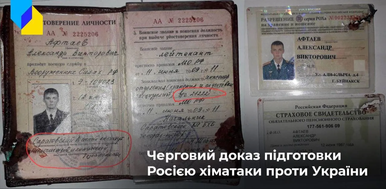 Серед великої кількості отриманих документів російських військових знайдено посвідчення і офіцера вузькопрофільної спеціалізації, на ім'я Афтаєва Алєксандра Вікторовича. До загибелі він служив у військовій частині 21222, а це – "Федеральне управління з безпечного зберігання та знищення хімічної зброї" у місті Пенза,