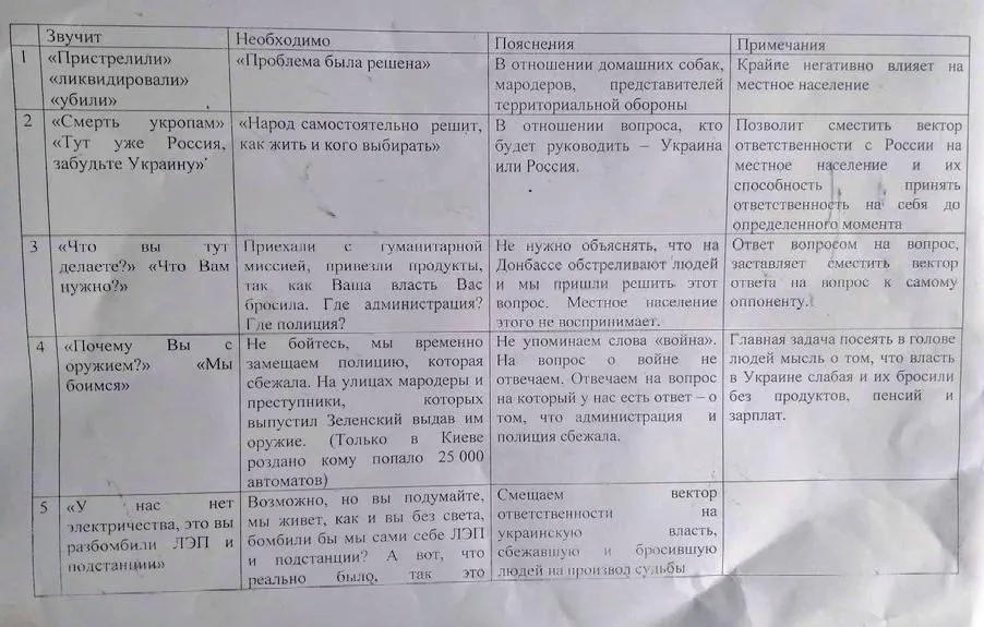 Судячи з усього, росіяни мали відповідати пропагандистськими штампами на будь-які запитання цивільних, навіть попри відчуття ненависті до всіх українців та бажання їх вбити. Втім, згідно з даними розвідки, вже після перших днів війни загарбникам надійшов наказ за потреби чи бажання розстрілювати навіть жінок з дітьми. Мовляв, нема чого "церемонитися з укропами", особливо якщо вони не вітають чужу армію з квітами та всіляко допомагають ЗСУ вбивати окупантів.