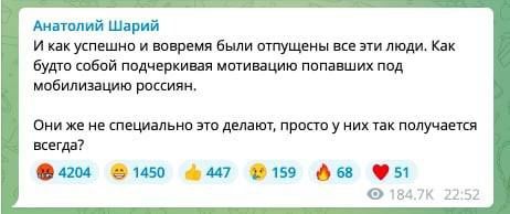 То ж тепер їм, м'яко кажучи, не дуже хочеться іти у військкомати, але "величезні протести" показали, що доведеться. Однак росіяни вже деморалізовані. Про це свідчить чимала кількість коментарів.