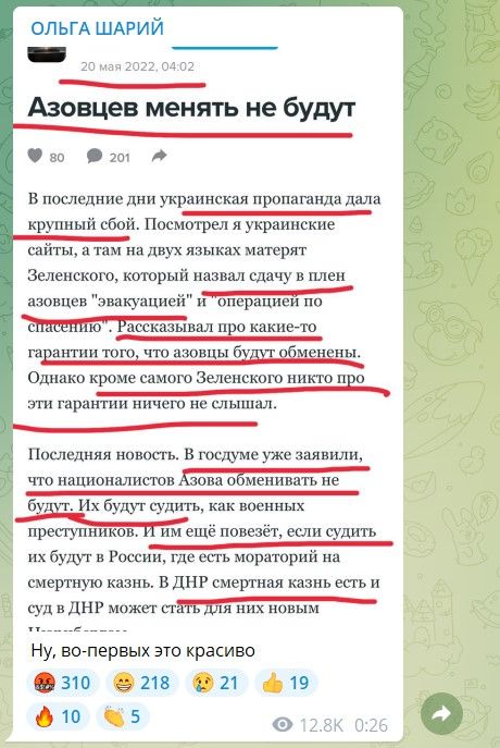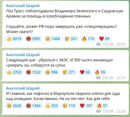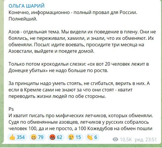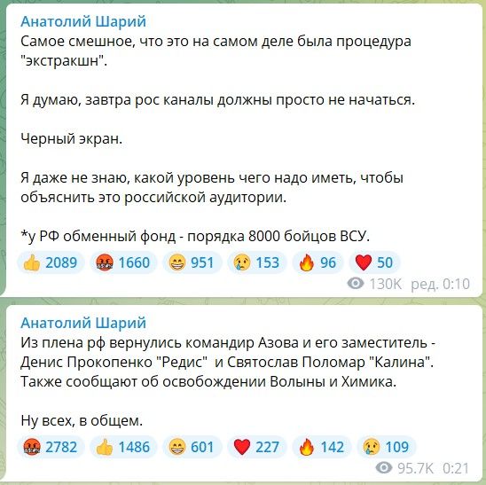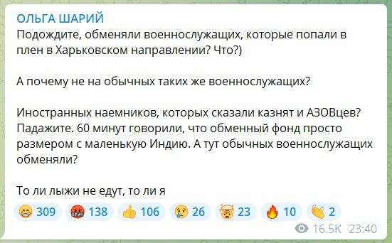 Своєю увагою не оминули тему обміну захисників та захисниць з "Азовсталі" й сімейство пропагандистів – анатолій та ольга шарії. Вочевидь ні їм, ні їхній авдиторії не подобається повернення українських героїв з російського полону.