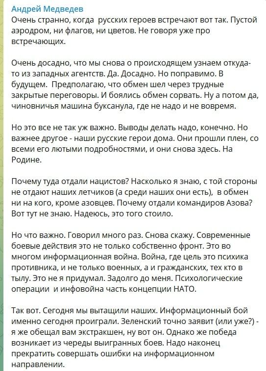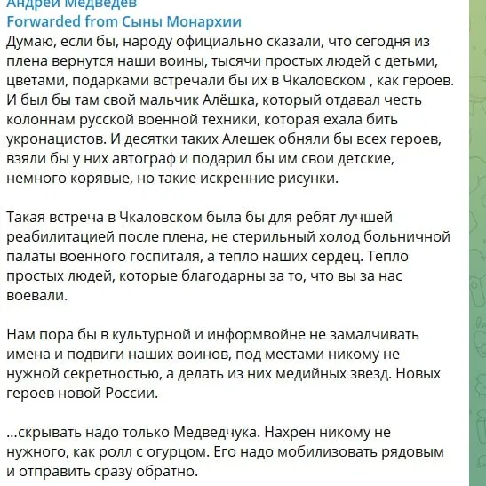 Російський журналіст андрєй мєдвєдєв щось там розпинався про героїчне повернення російських військових, а також ідеальний сценарій їхньої зустрічі. Але наше око зачепилося за останній абзац, присвячений медведчуку.