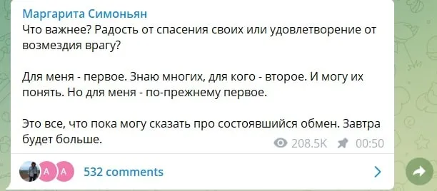 Щось поплавило також і маргариту сімоньян. Вона упродовж останніх кількох днів настільки активно дає задню, що ми почали за неї переживати. Чи не приймає вона часом якісь ще більш заборонені препарати? Адже у своєму дописі пропагандистка вирішила зробити акцент на радощах, пов'язаних з поверненням додому росіян. Мовляв, це зараз на першому плані. А от помсту ворогові – Україні – можна відкласти на потім. Потрібно попросити, щоб з її акаунту вилогінилися українські спецслужби, бо росіяни щось не надто тішаться поверненню своїх.