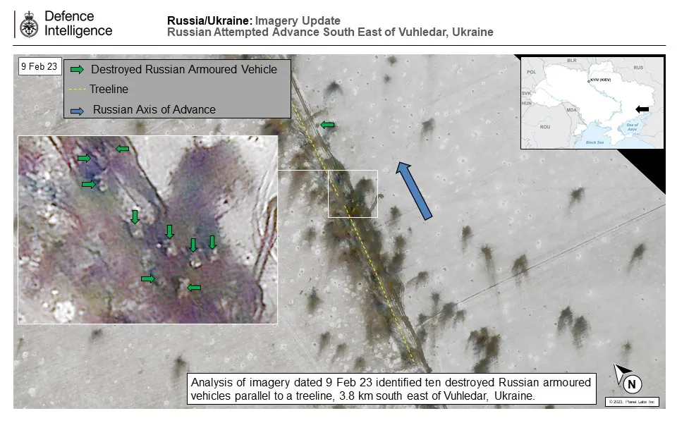 Британська розвідка оприлюднила знімок з супутника, зроблений на Вугледарському напрямку. На зображенні видно знищену російську техніку, яка, ймовірно, належала до 155-ї бригади морської піхоти.