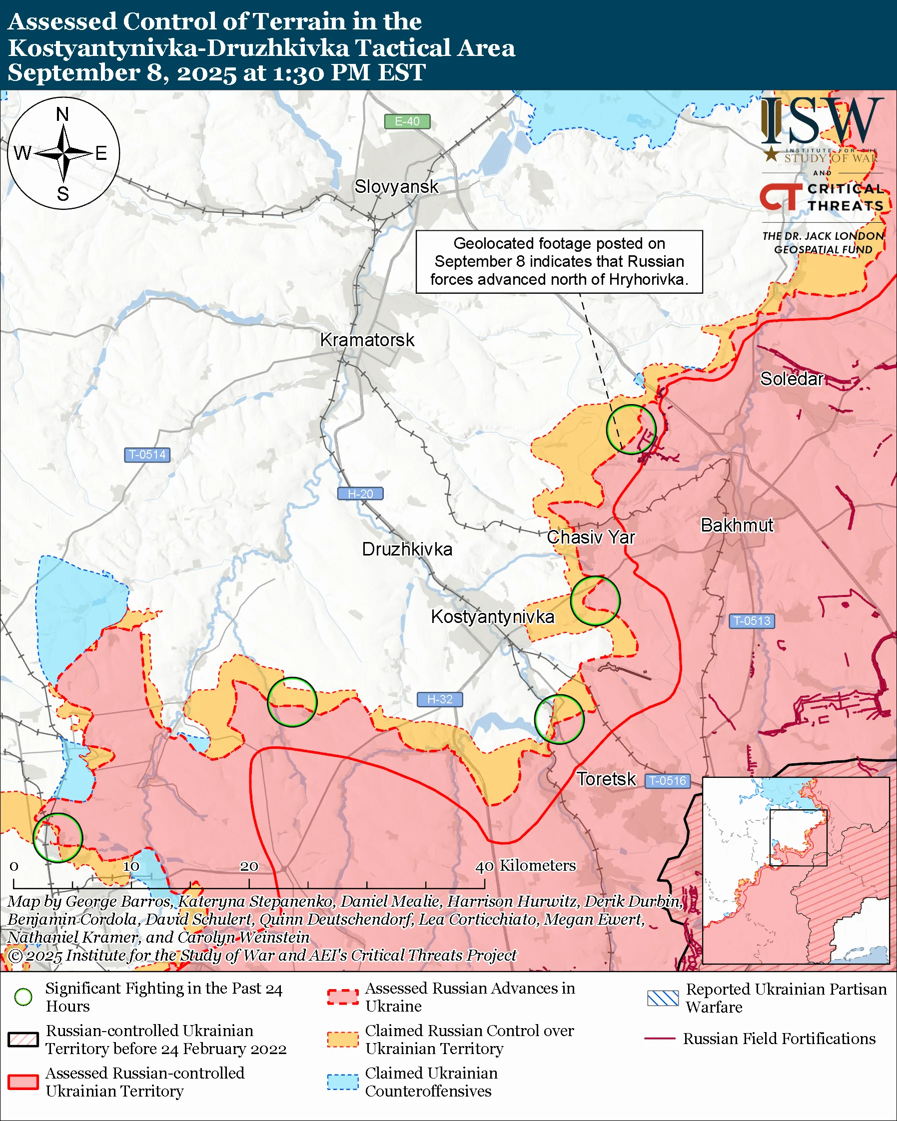 - Нещодавно російські війська просунулися в тактичному районі Костянтинівка-Дружківка. Геолокаційні відеозаписи, опубліковані 8 вересня, свідчать про те, що ворожа армія нещодавно просунулася на північ від Григорівки (на північний схід від Костянтинівки).