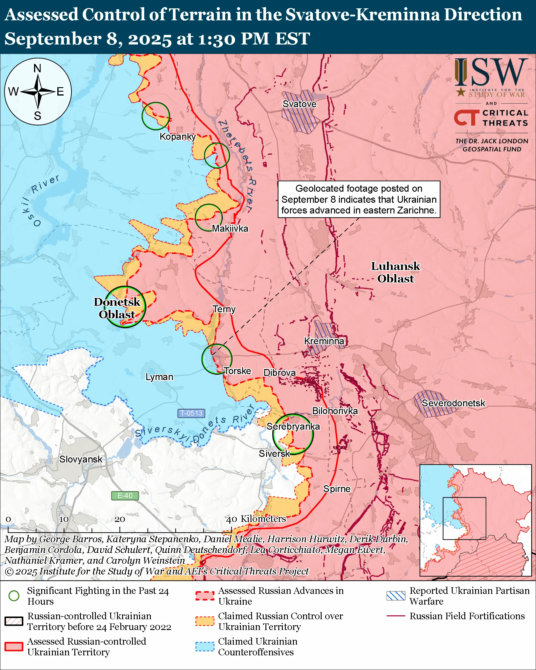 - Нещодавно українські війська просунулися на Лиманському напрямку. Геолокаційні кадри, опубліковані 8 вересня, свідчать про те, що Сили оборони просунулися на сході Зарічного (на схід від Лимана).