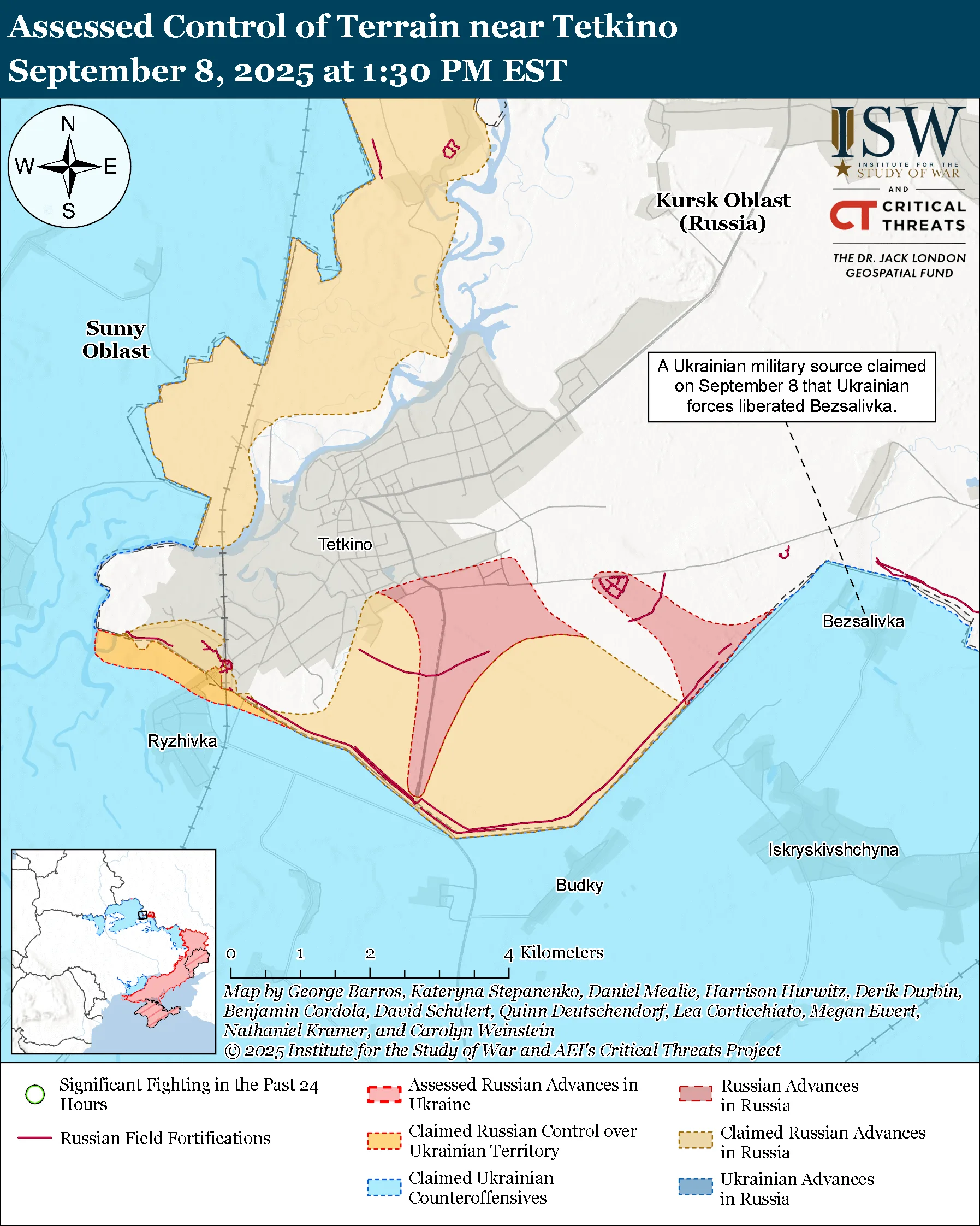 - Українські війська нещодавно просунулися на півночі Сумської області. 8 вересня український військовий оглядач Костянтин Машовець заявив, що Сили оборони повернули собі Безсалівку (на північний захід Сум).
