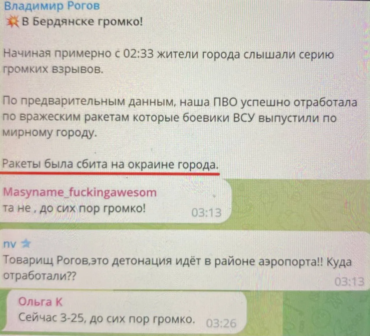 Ці слова Федорова підтвердили у телеграм-каналі руху опору "Зла Мавка". Зокрема, ексглава роскосмосу Дмітрій Рогозін рапортував про "успішне збиття ракет російською ППО", однак люди у коментарях заперечували його слова.