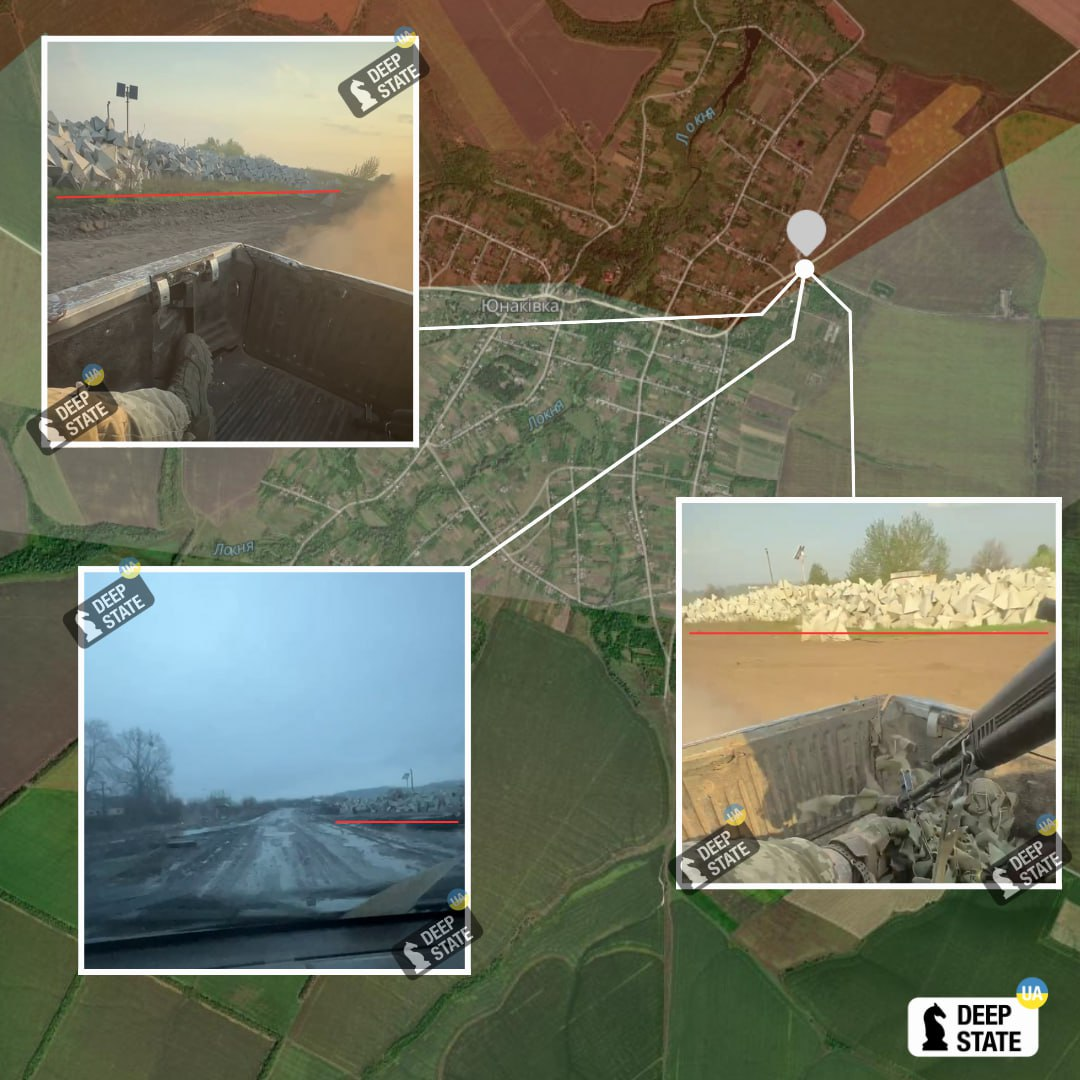 Аналітики DeepState опублікували фото з околиць населеного пункту Юнаківка на Сумщині. На них можна помітити, "зуби дракона", які лежать вздовж дороги.