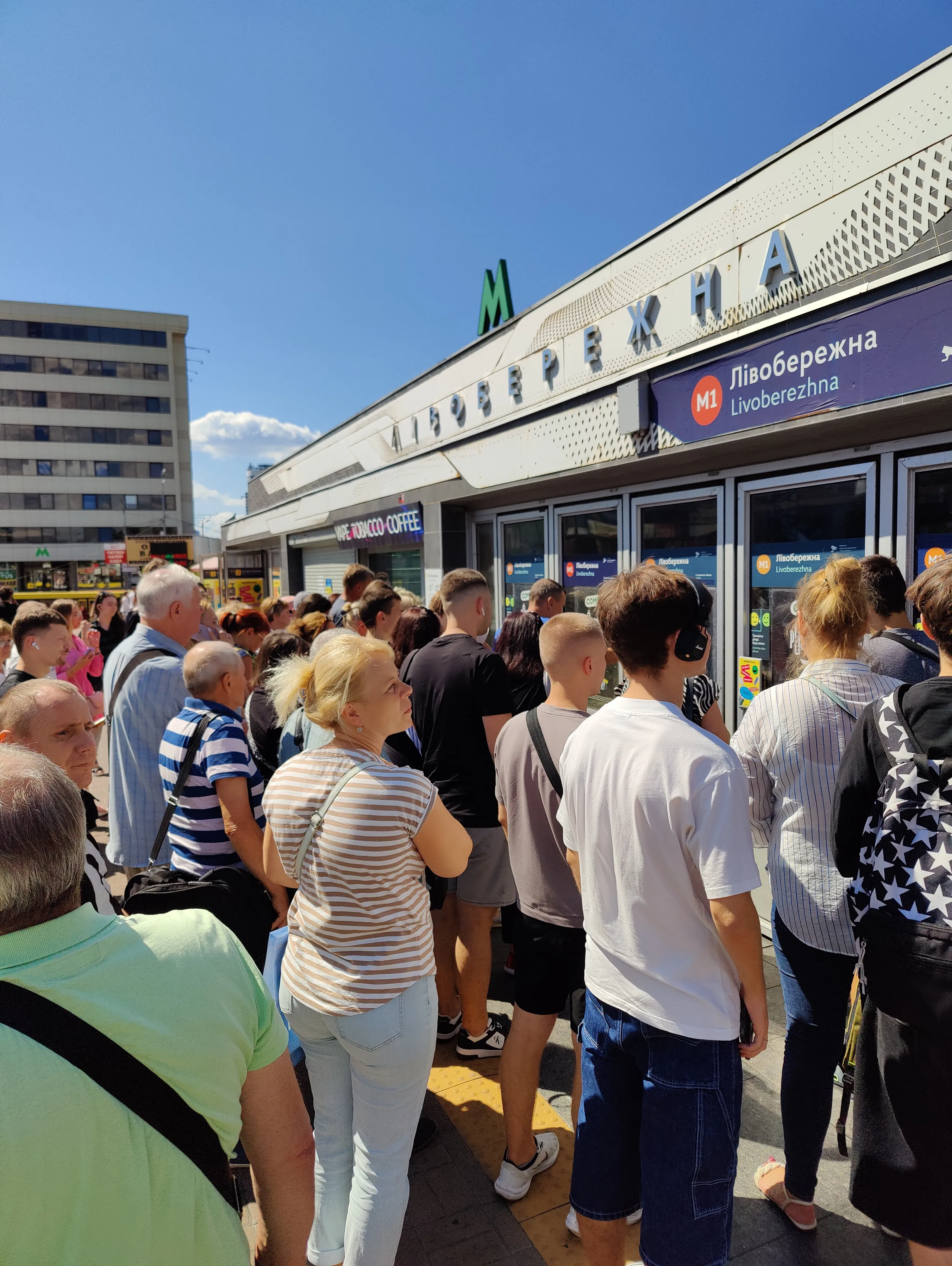 Натовп біля станції метро "Лівобережна" після відбою повітряної тривоги влітку 2024 року / Фото Лева Шевченка, 24 Канал