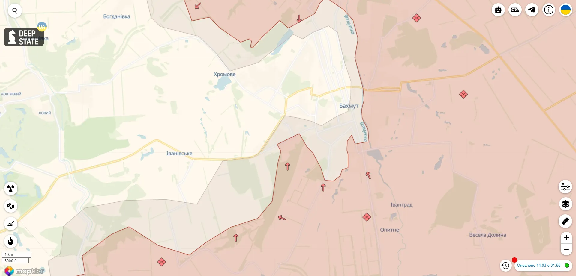 Росіяни підійшли до траси на Бахмут, але там уже працюють танки ЗСУ / Скриншот DeepStateMap