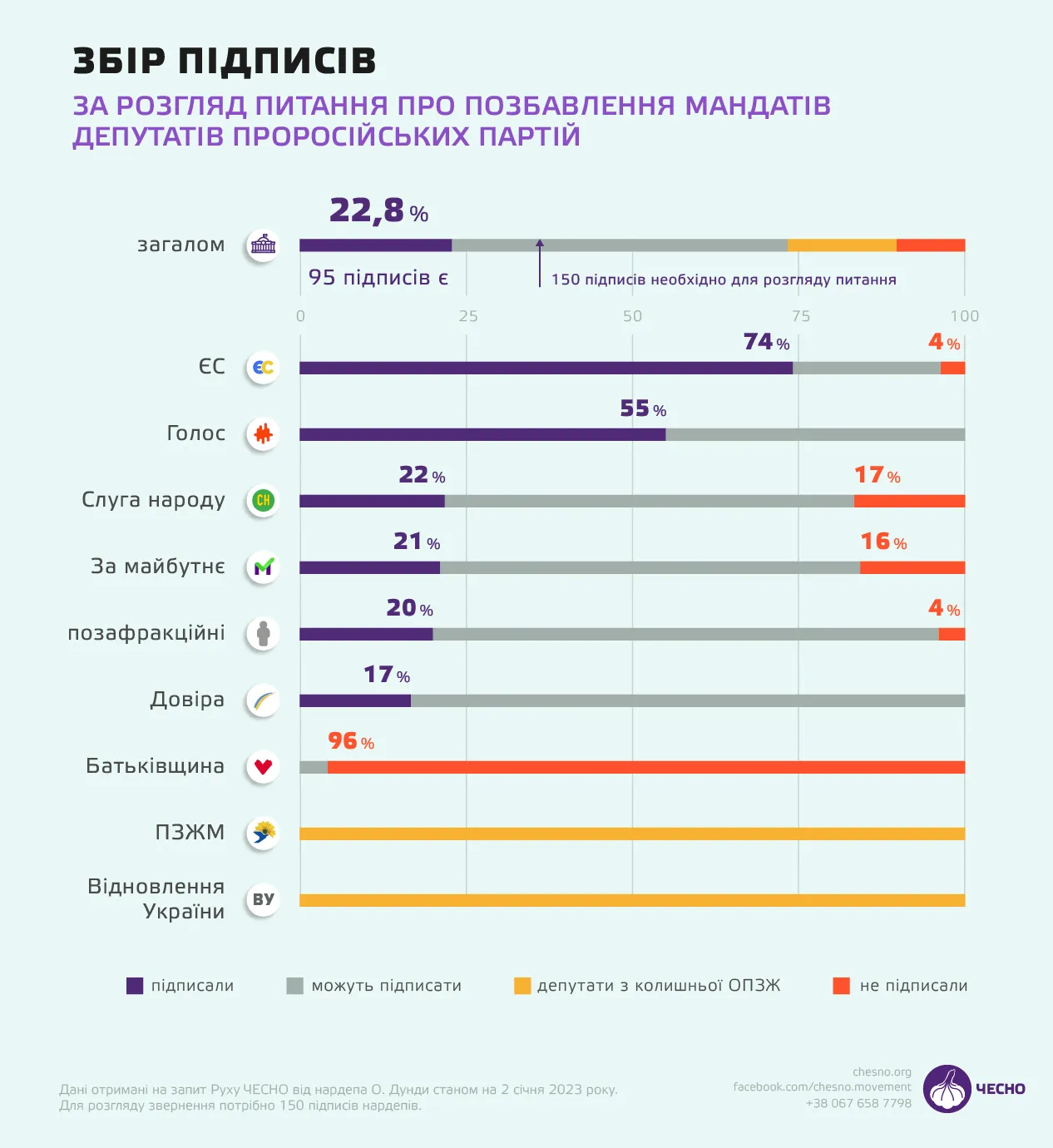 Наразі є 98 підписів із 150 необхідних. Найбільший відсоток голосів станом на 2 січня дали фракції "Європейської солідарності" та "Голосу".