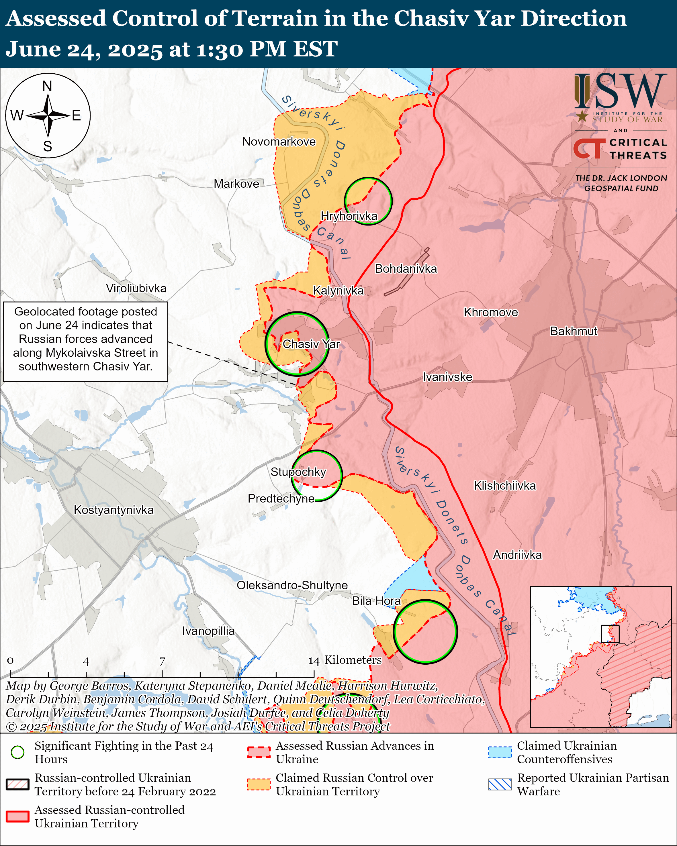 - Російські війська просунулися біля Часового Яру. Геолокаційні кадри від 24 червня вказують, що вони пройшли в південно-західному напрямку від міста.
