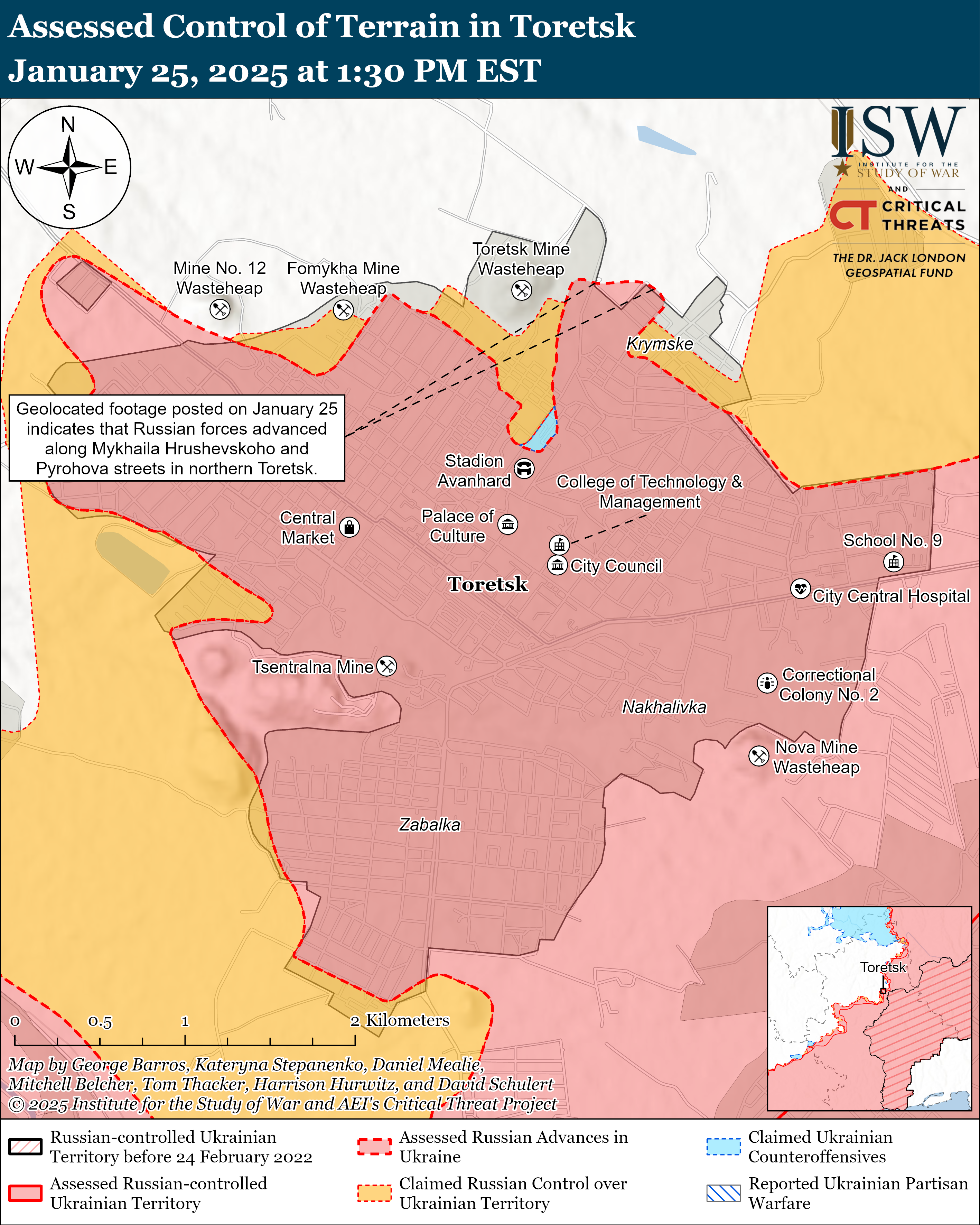 - Однак російські війська просунулися на Торецькому напрямку. Геолокаційні кадри за 25 січня вказують на те, що окупанти пройшли вулицями Михайла Грушевського та Пирогова на півночі Торецька.