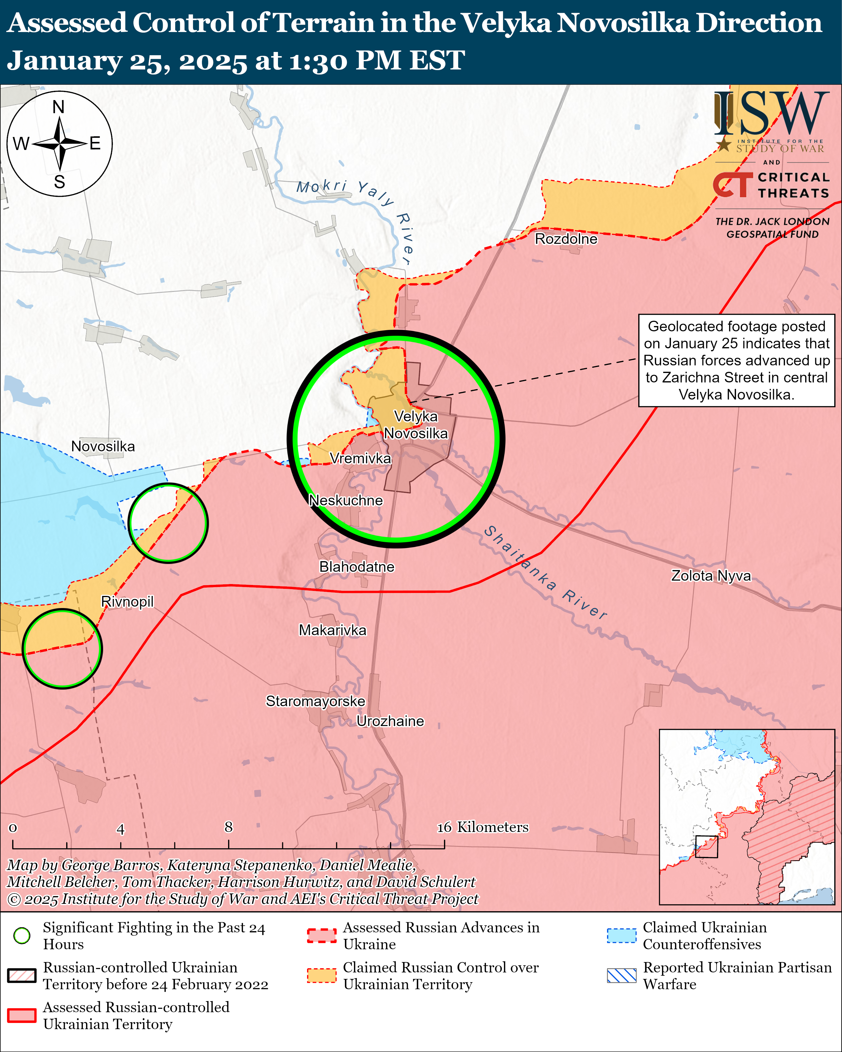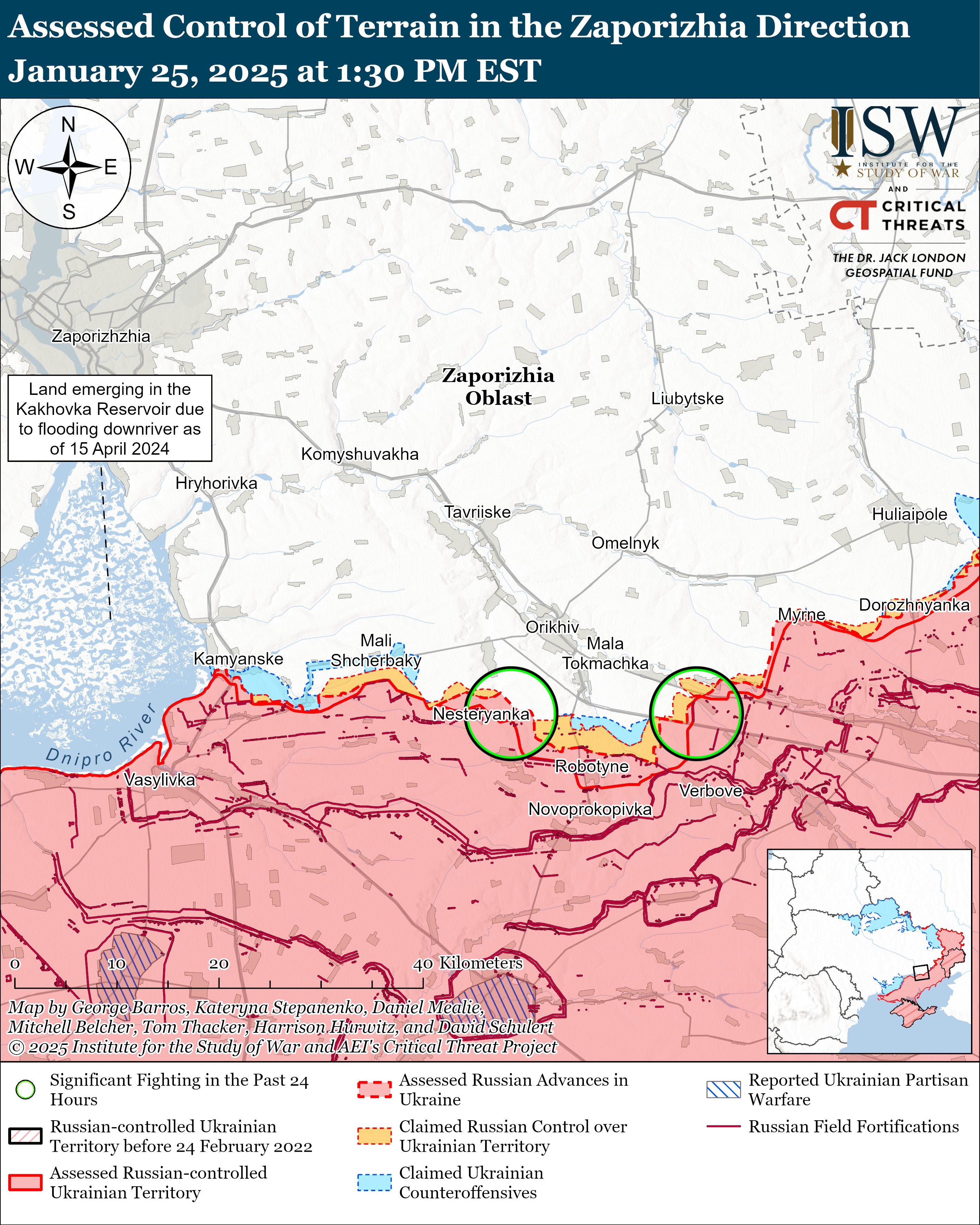 - 24 і 25 січня російські війська продовжували наземні наступи в західній частині Запорізької області, зокрема на північний схід від Роботиного біля Малої Токмачки та на північ від Роботиного біля Новоданилівки, але не мали підтверджених просувань. На Херсонському напрямку просувань у них теж не було.