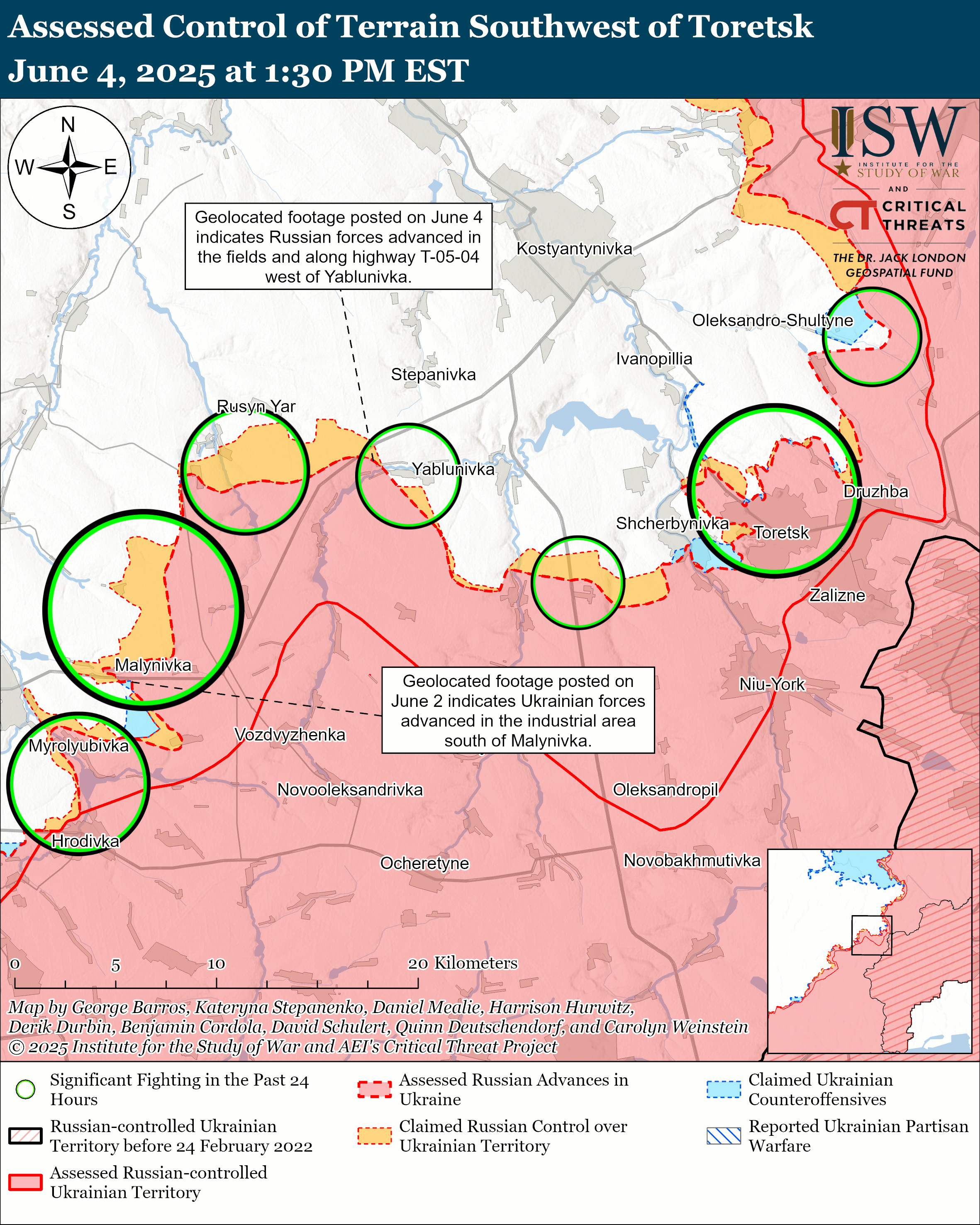 - Водночас українські війська просунулися на Покровському напрямку. Геолокаційні відео за 2 червня показують їх на південь від Малинівки, що на північний схід від Покровська.