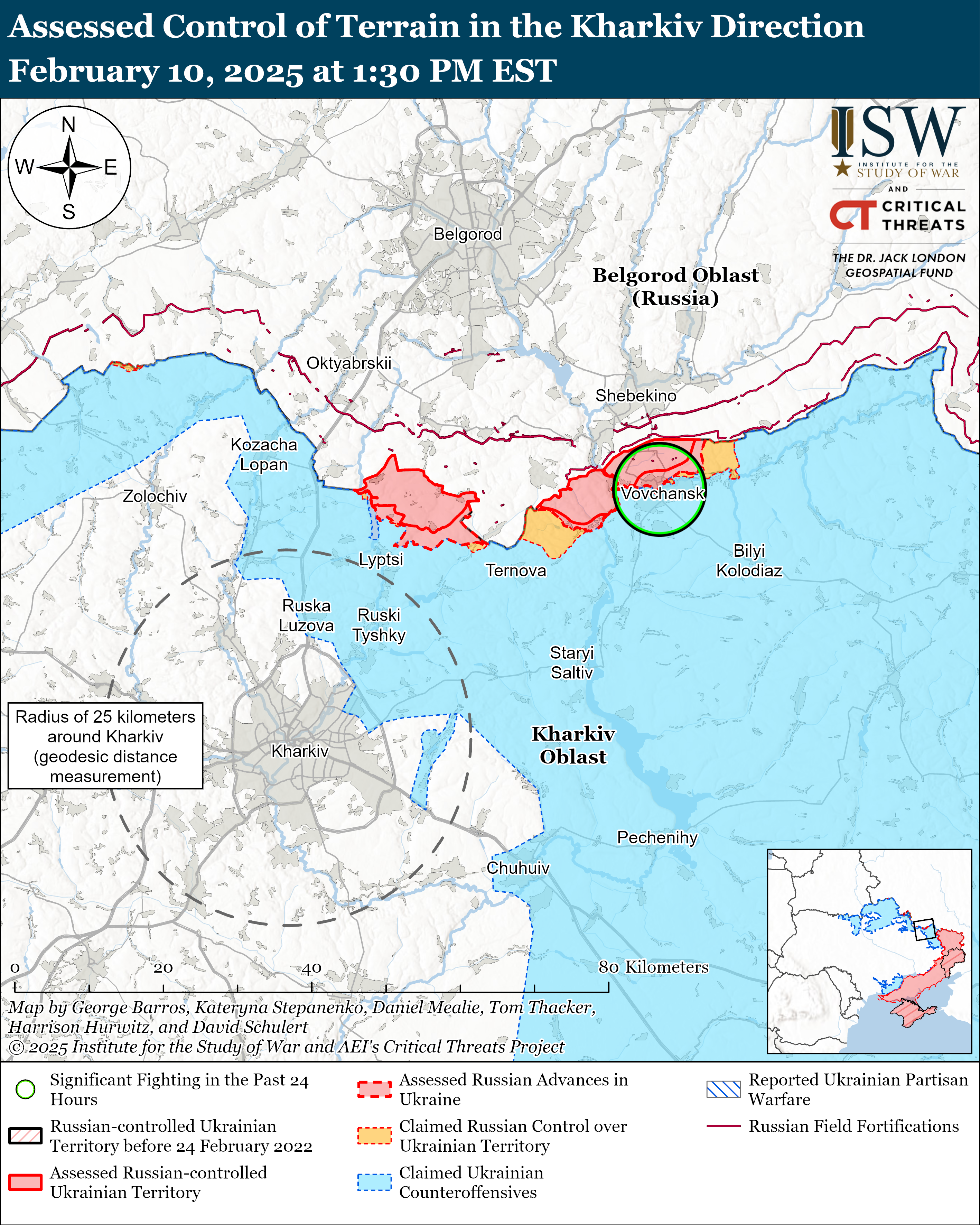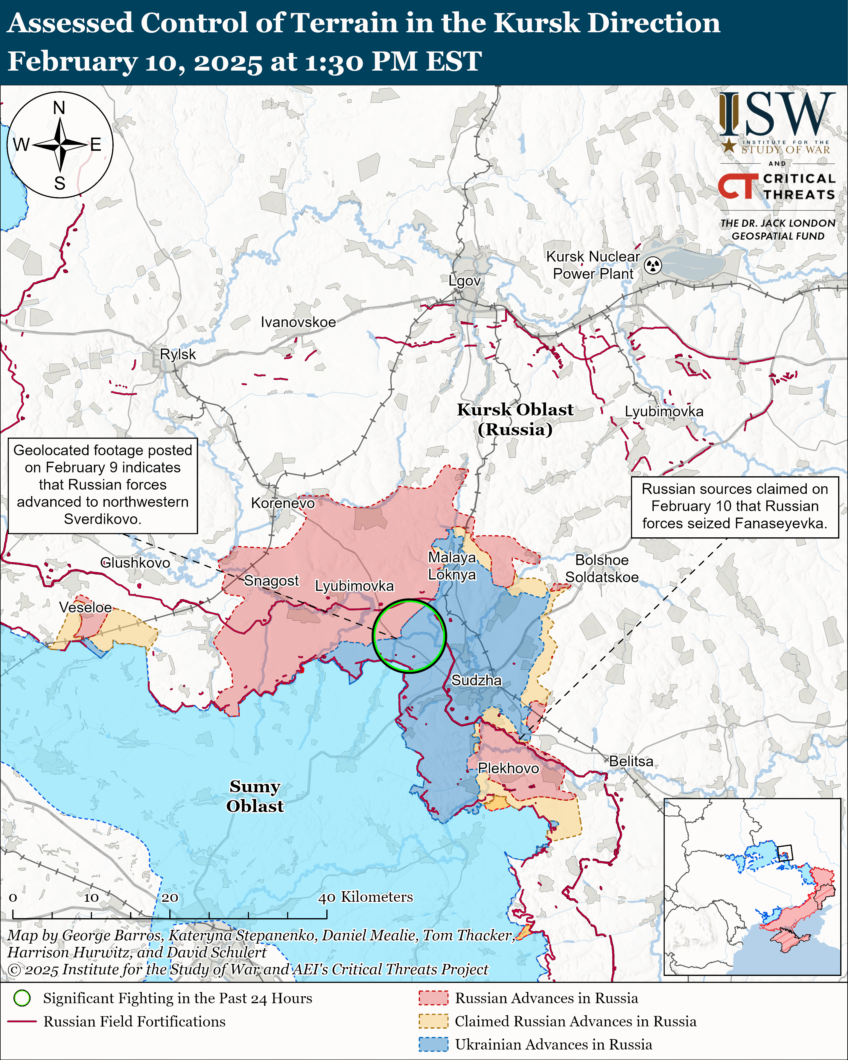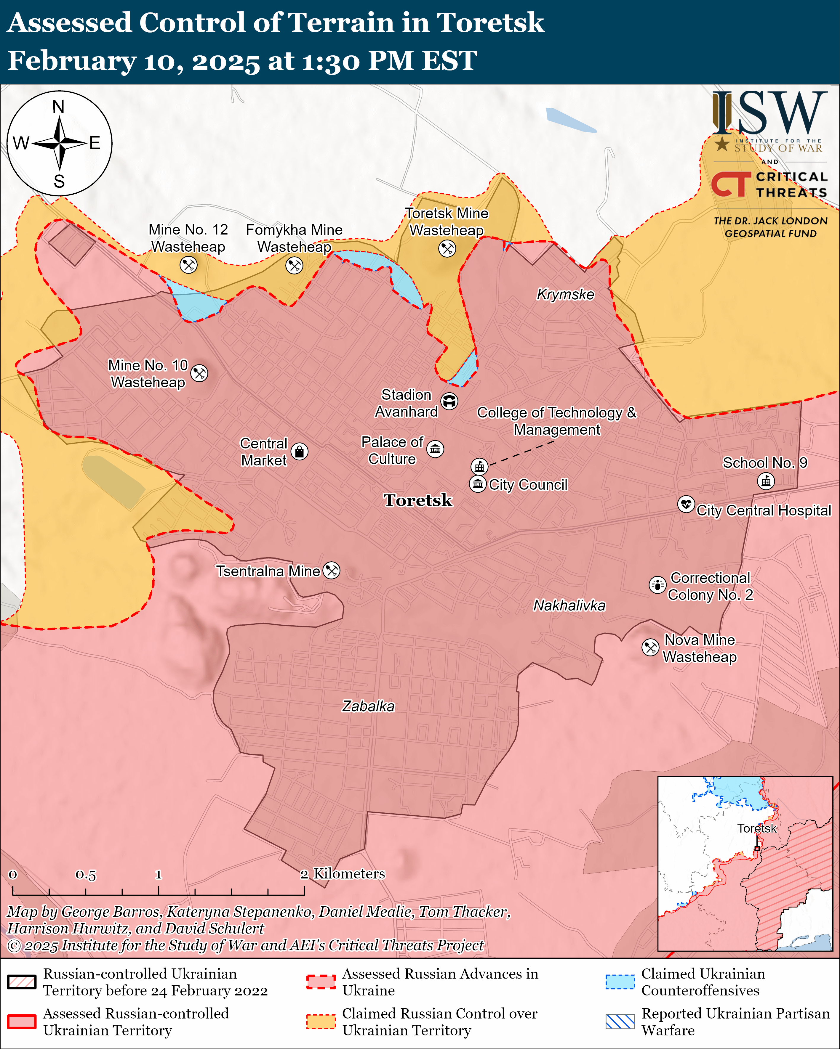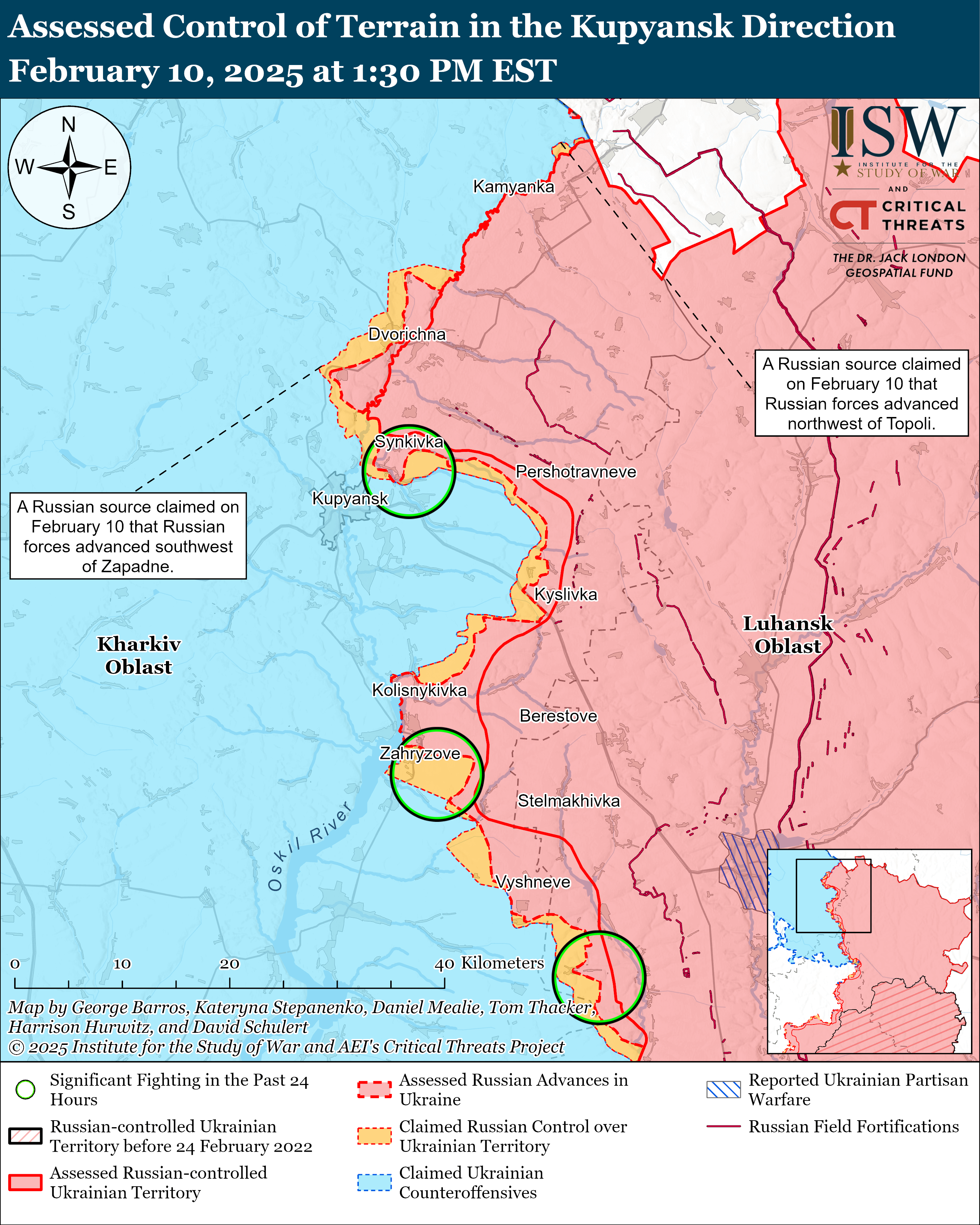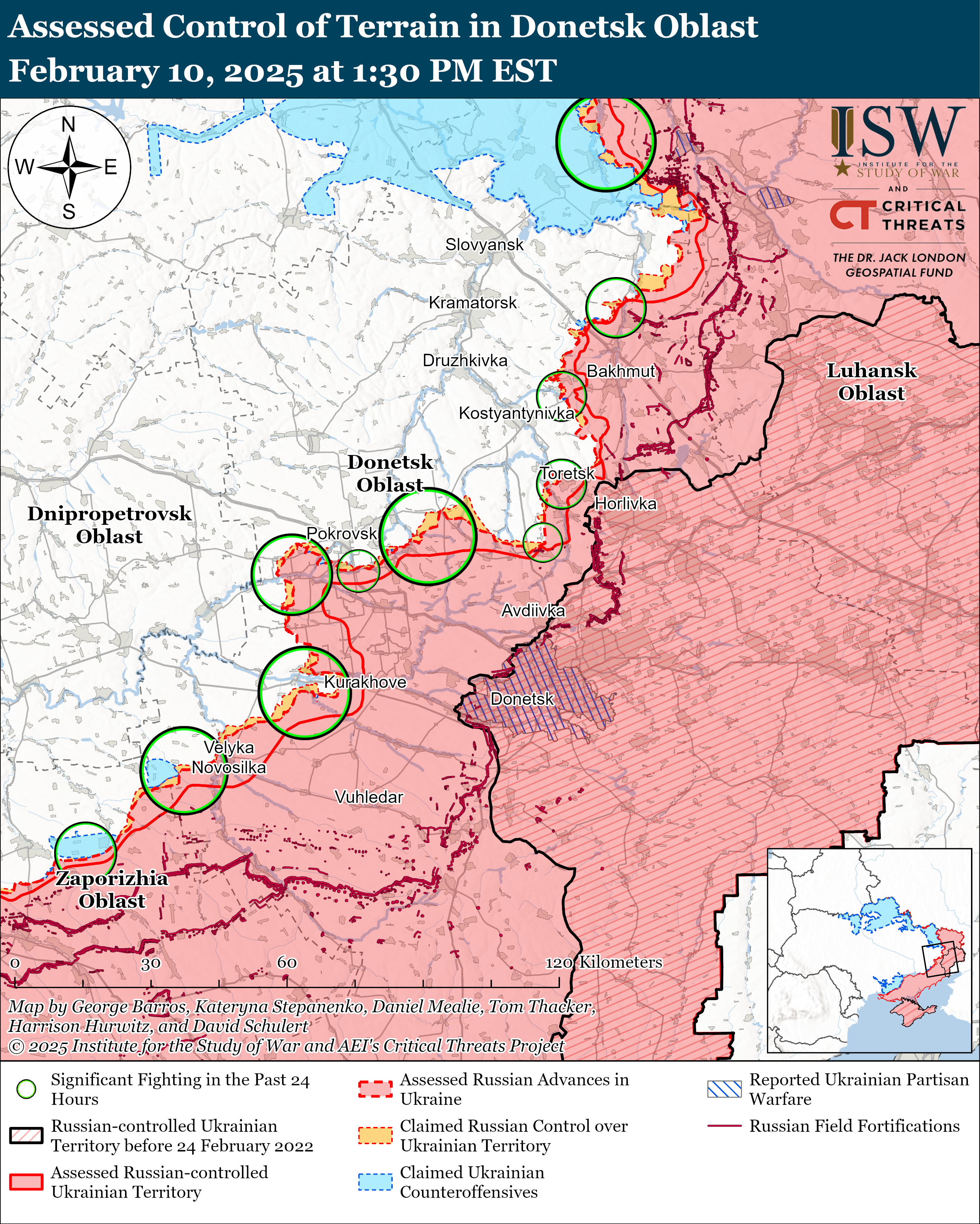 Про це повідомляє 24 Канал з посиланням на звіт ISW. Там оприлюднили головні висновки останніх боїв та показали карти зіткнень впродовж 10 лютого.