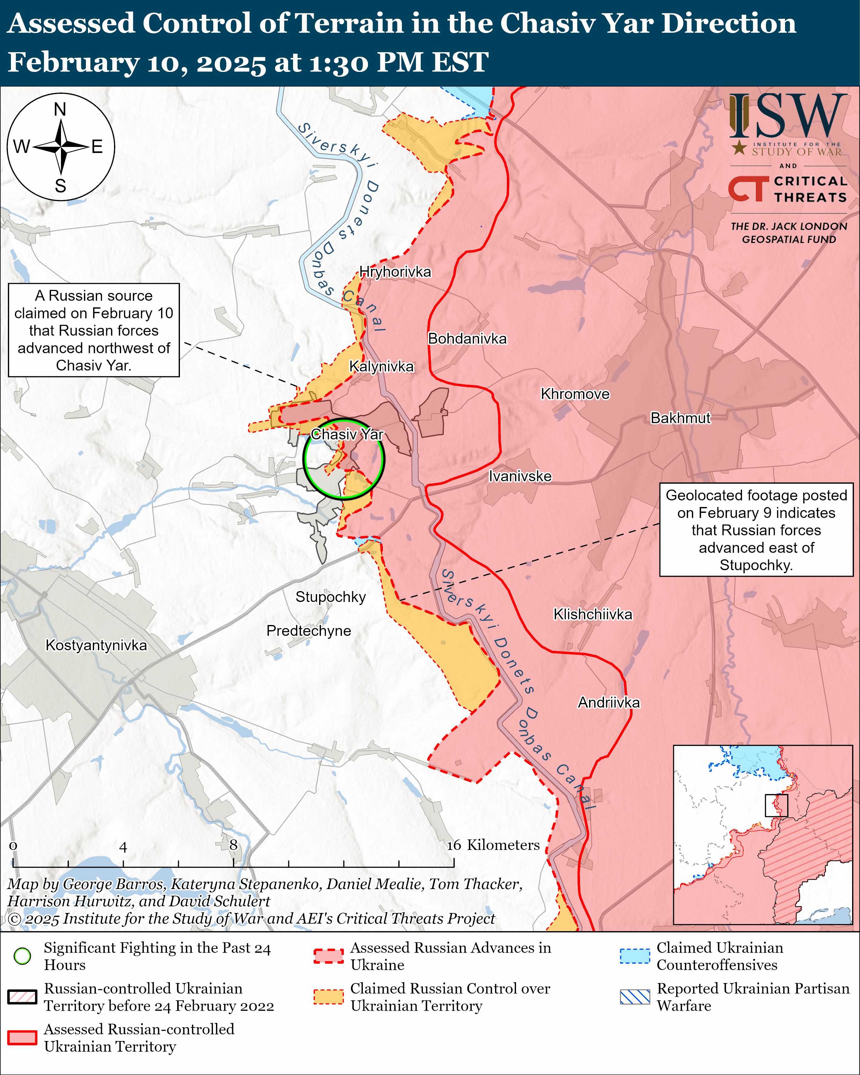 - Водночас росіяни просунулися на південь від населеного пункту Часів Яр Донецької області, бо в цьому районі тривали бої. Російські війська продовжували наземні атаки в Часовому Яру та на північний схід від Часового Яру поблизу Васюківки.