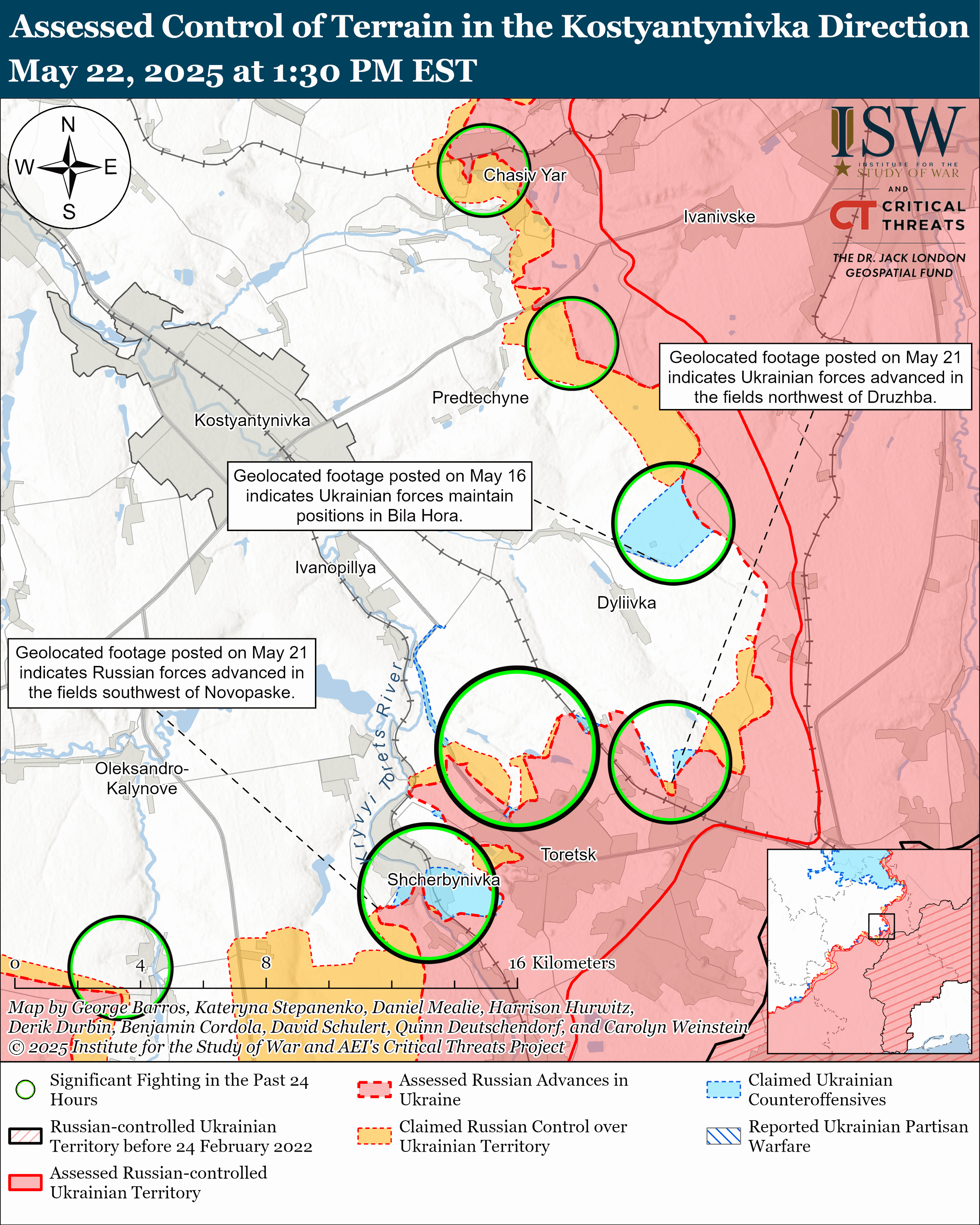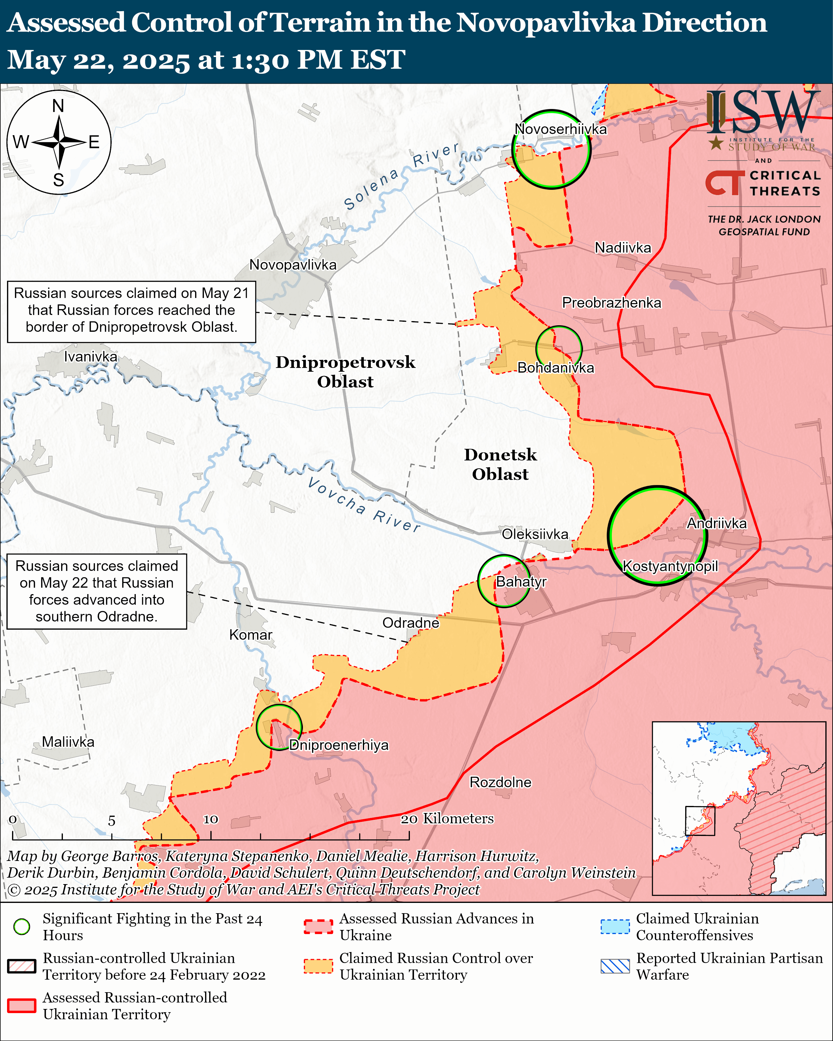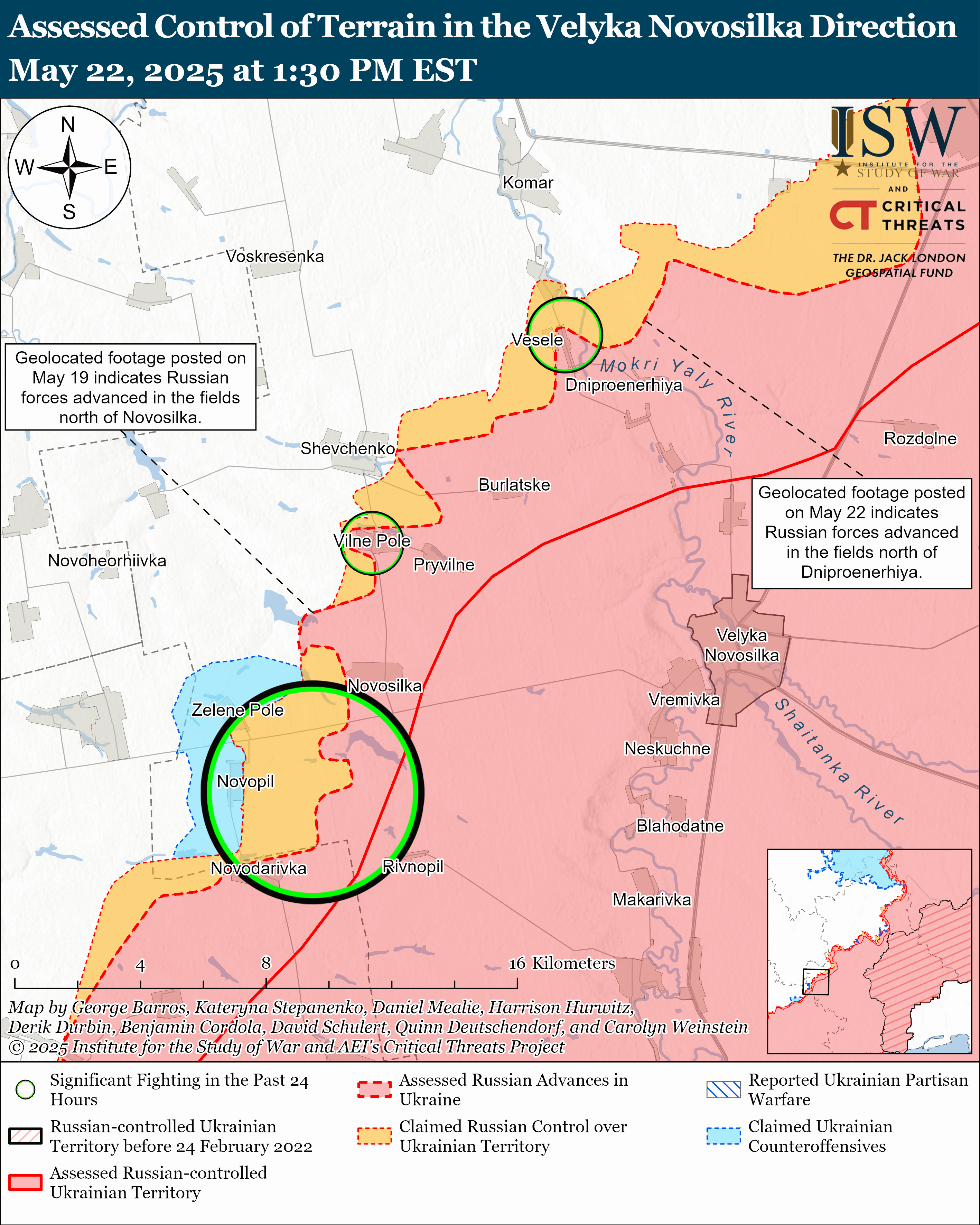 - Російські війська просунулися в районі Великої Новосілки. Геолокаційні відеозаписи від 22 травня свідчать, що вони пройшли на північ від Дніпроенергії, що на північний захід від міста, та на північний захід від Новосілки.