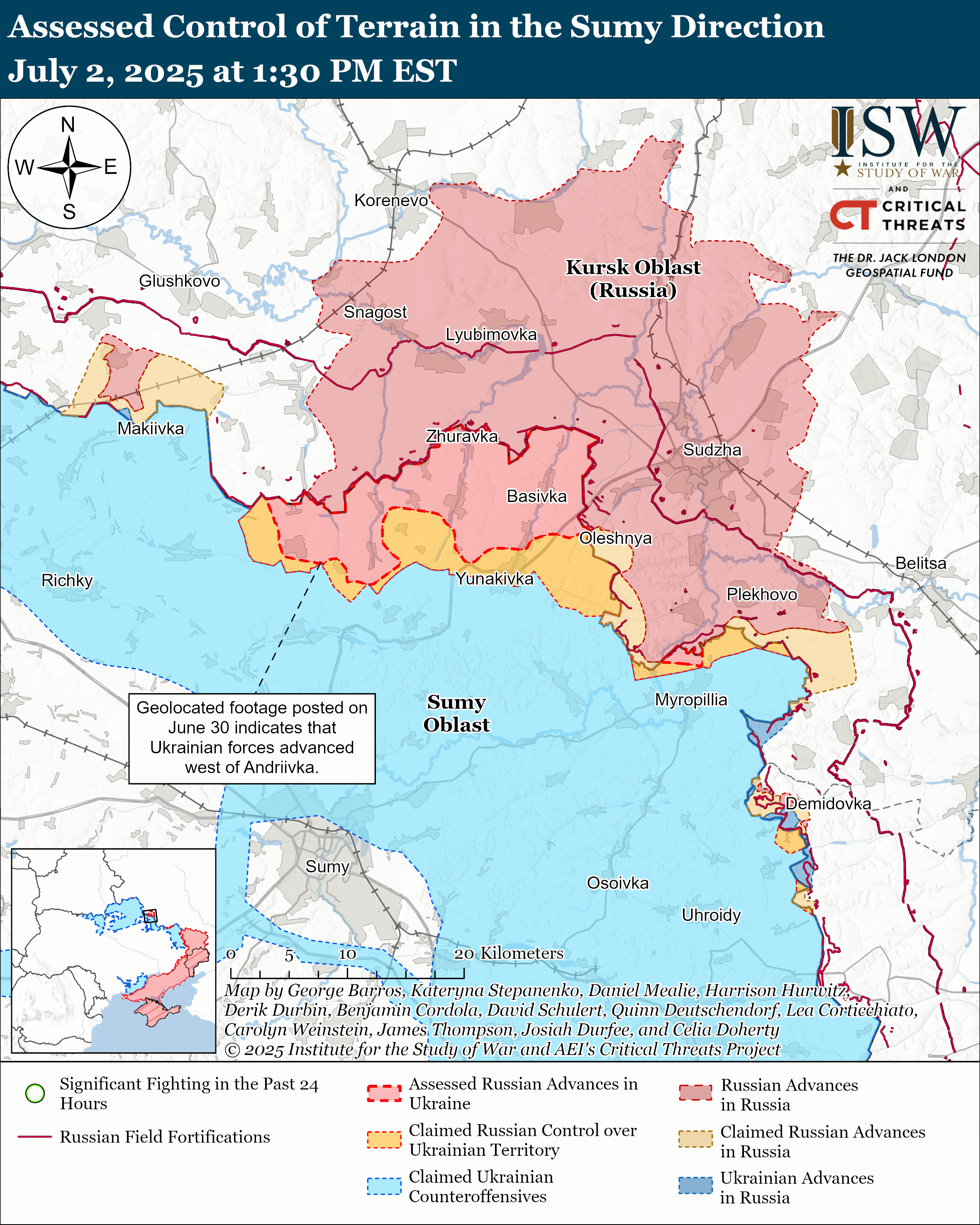 - Бої в Курській області продовжилися 2 липня, змін не зафіксовано. Водночас українські війська просунулися на півночі Сумської області. Геолокаційні відео ще від 29 червня свідчать, що вони пройшли на захід від Андріївки, це на північ від Сум.