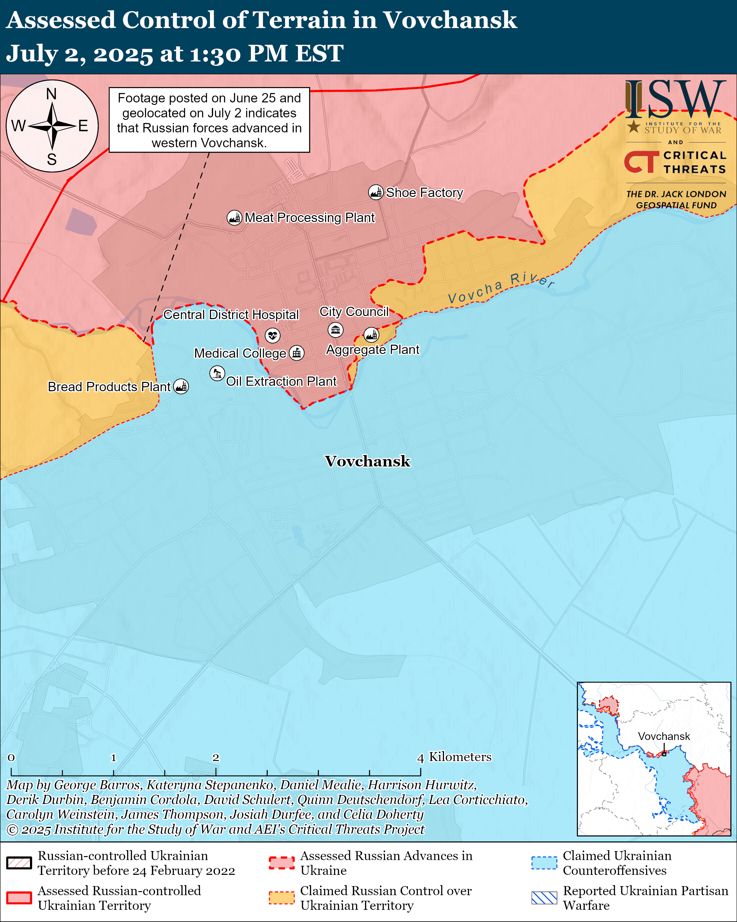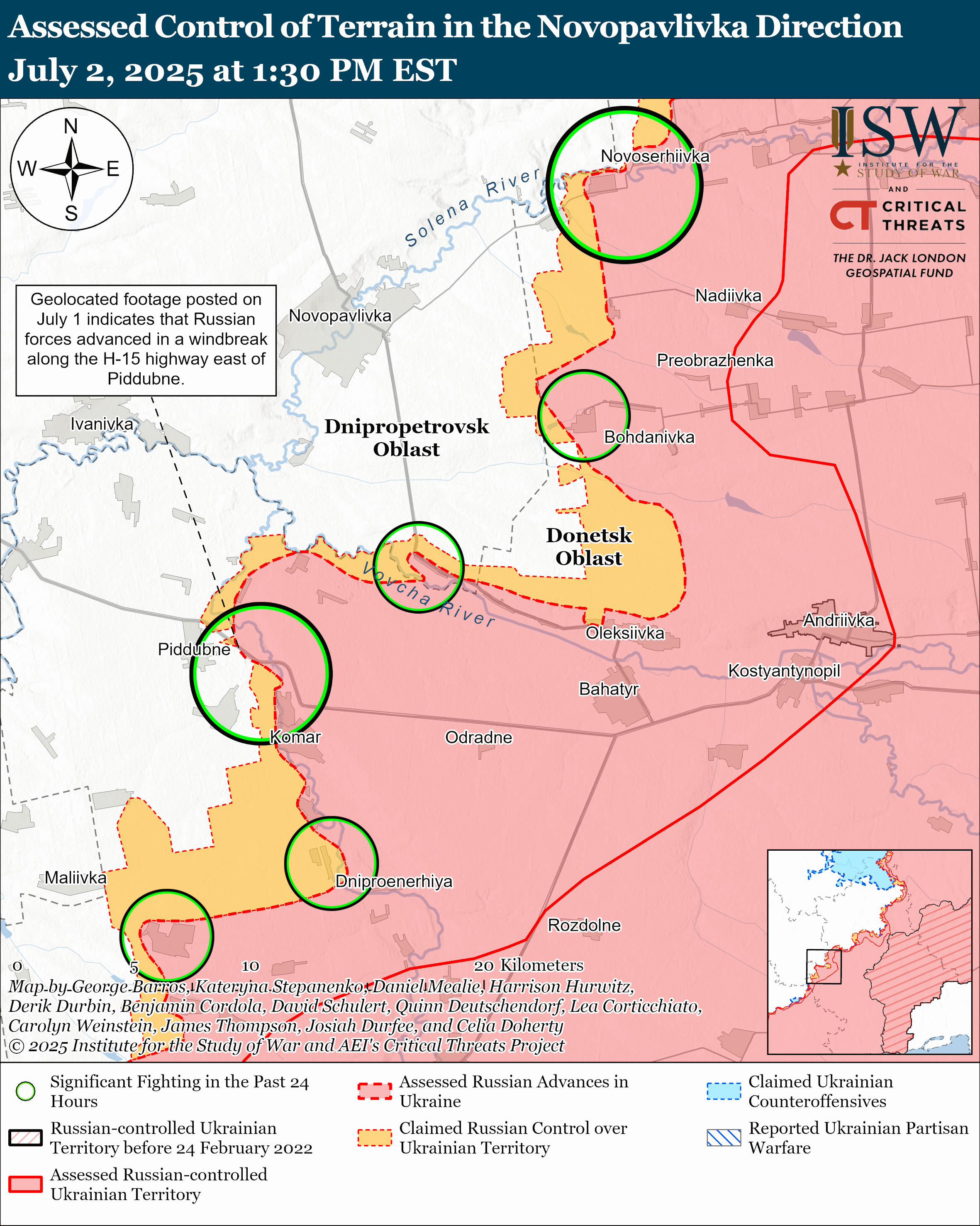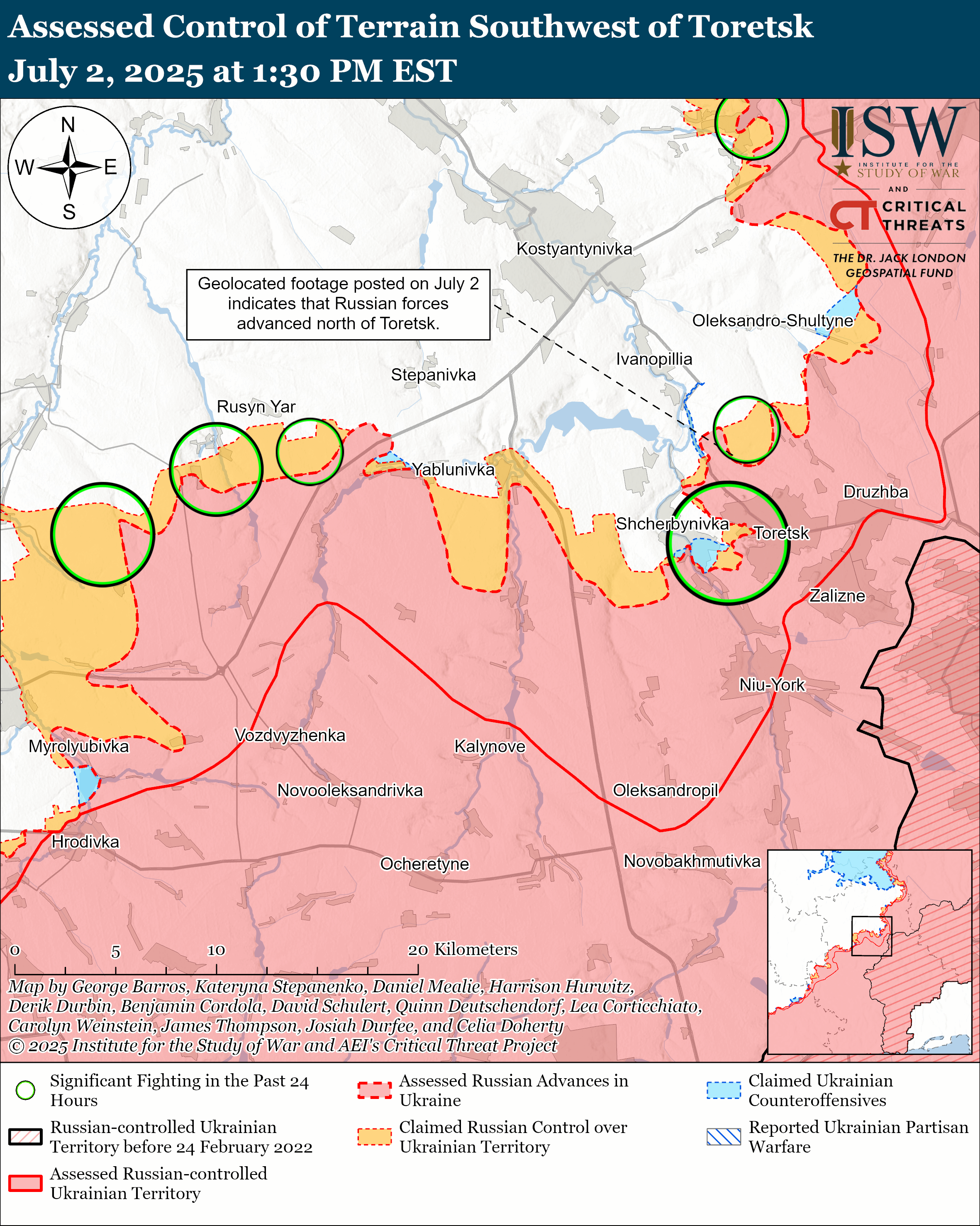 - Водночас російські війська просунулися на півночі Харківської області (також судячи з червневих геолокаційних відео) та поблизу Торецька й Новопавлівки (саме ці зміни сталися на початку липня).