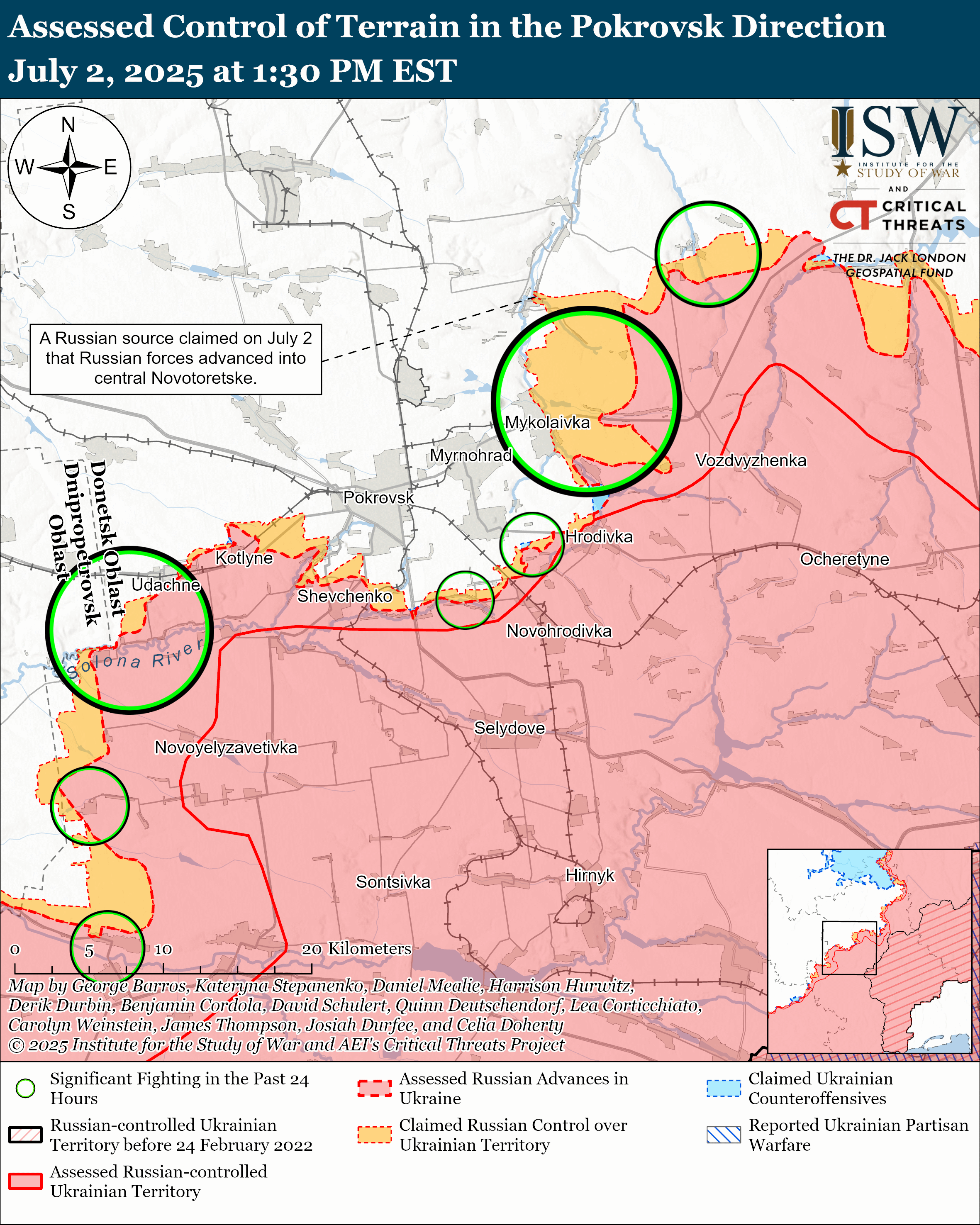 У попередньому звіті Інститут вивчення війни писав, що українські війська просунулися в районі Покровська. Російські ж пройшли в районі Торецька та Новопавлівки.