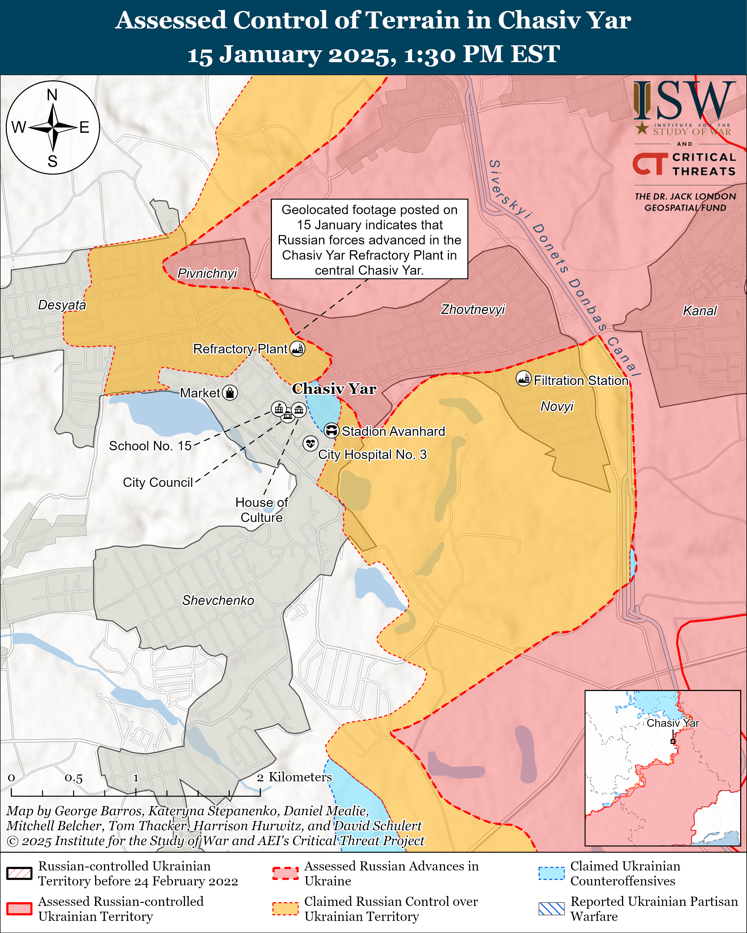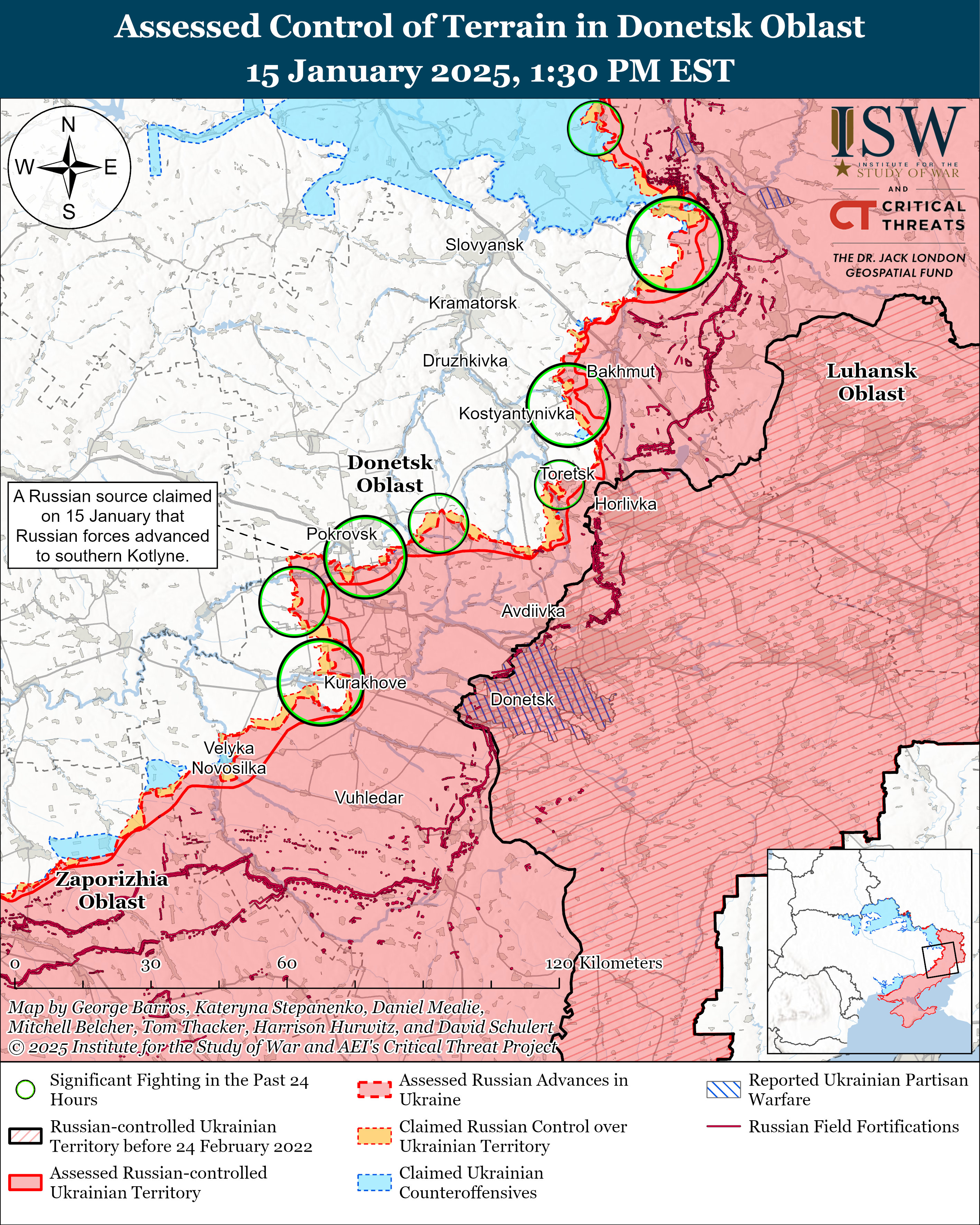 - Також російські війська просунулися в межах Торецька. Геолокаційні кадри, опубліковані 14 січня, показують, що це сталося в північно-західній та північній частинах міста. Росіяни стверджували, що наступали біля Щербинівки, але ISW не знайшов підтвердження цієї заяви.