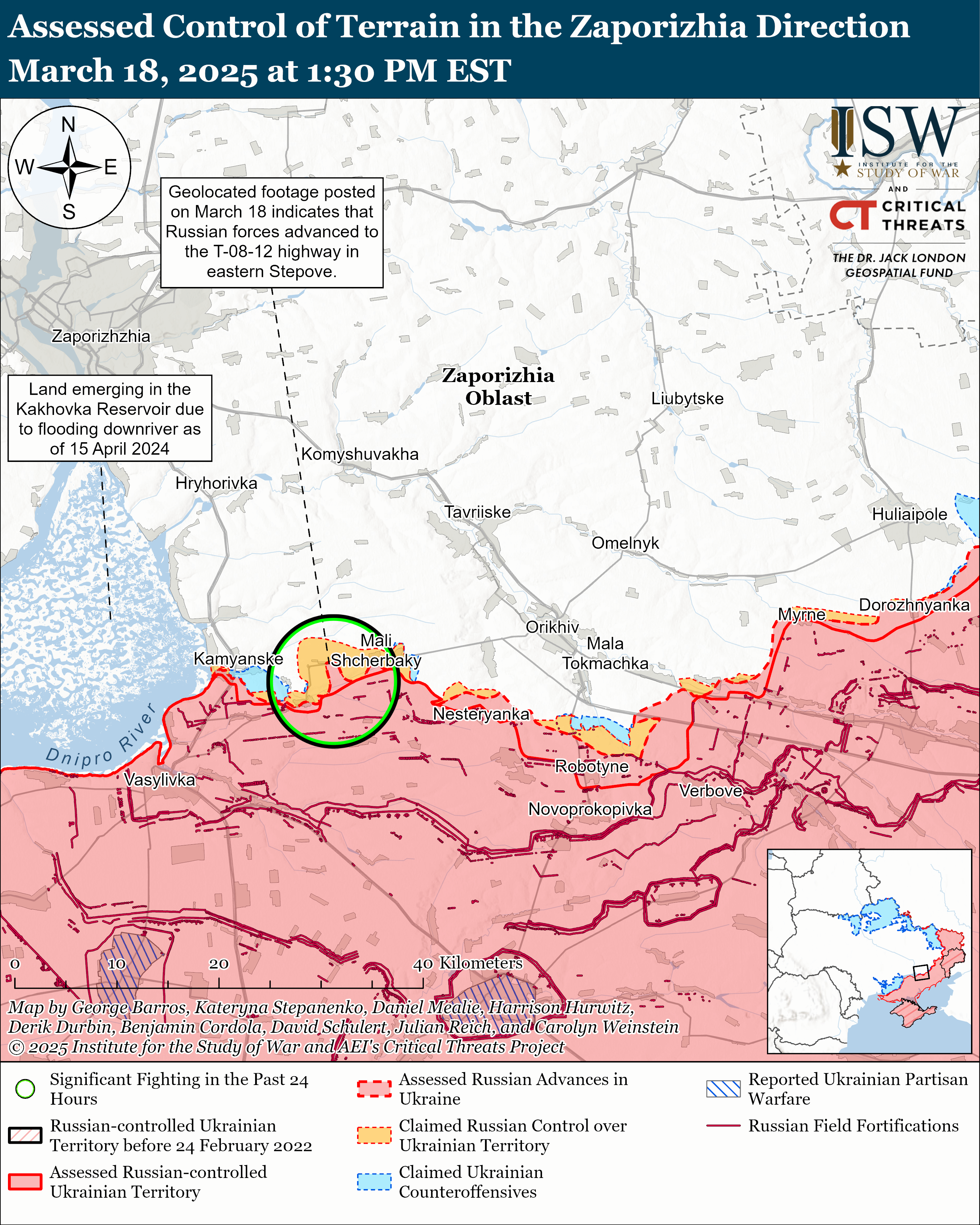 - Але російські війська просунулися в західній частині Запорізької області на тлі посилення своїх наступальних операцій у цьому районі. Геолокаційні кадри від 18 березня показують, що це сталося у східному Степовому, що на схід від Кам’янського.