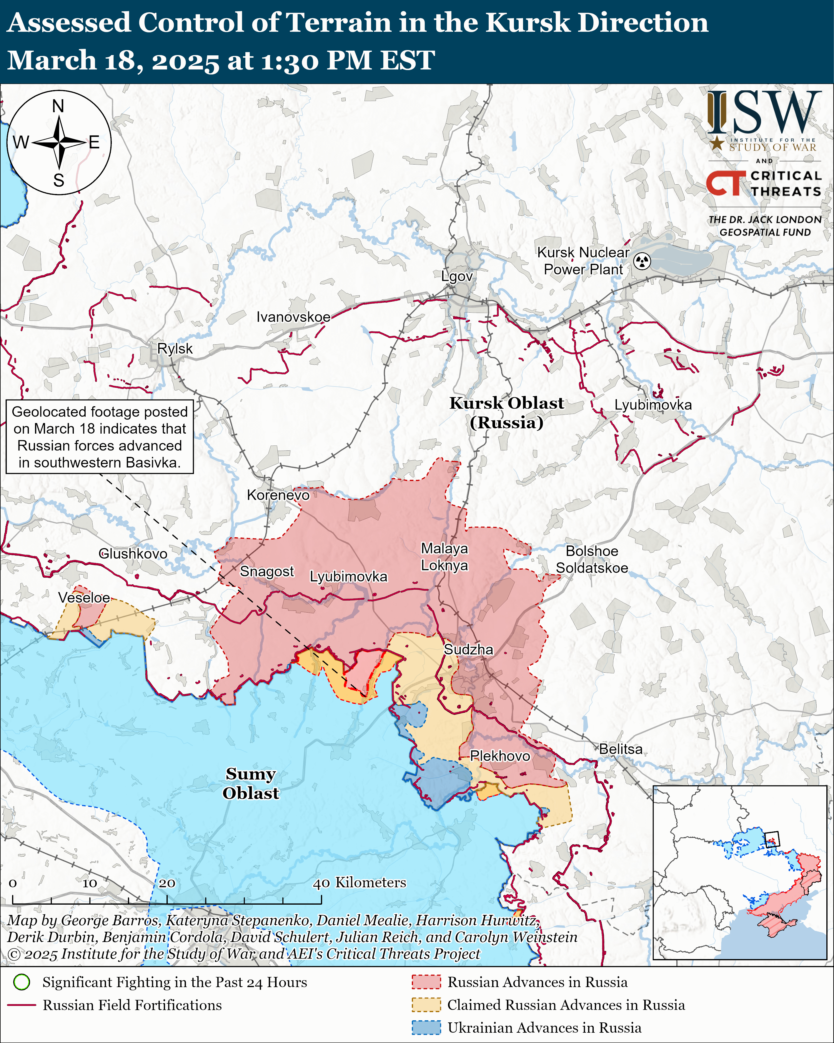 - Російські джерела стверджували, що українські сили атакували вздовж кордону Сумської та Бєлгородської областей. ISW не прокоментував достовірність цих заяв.
