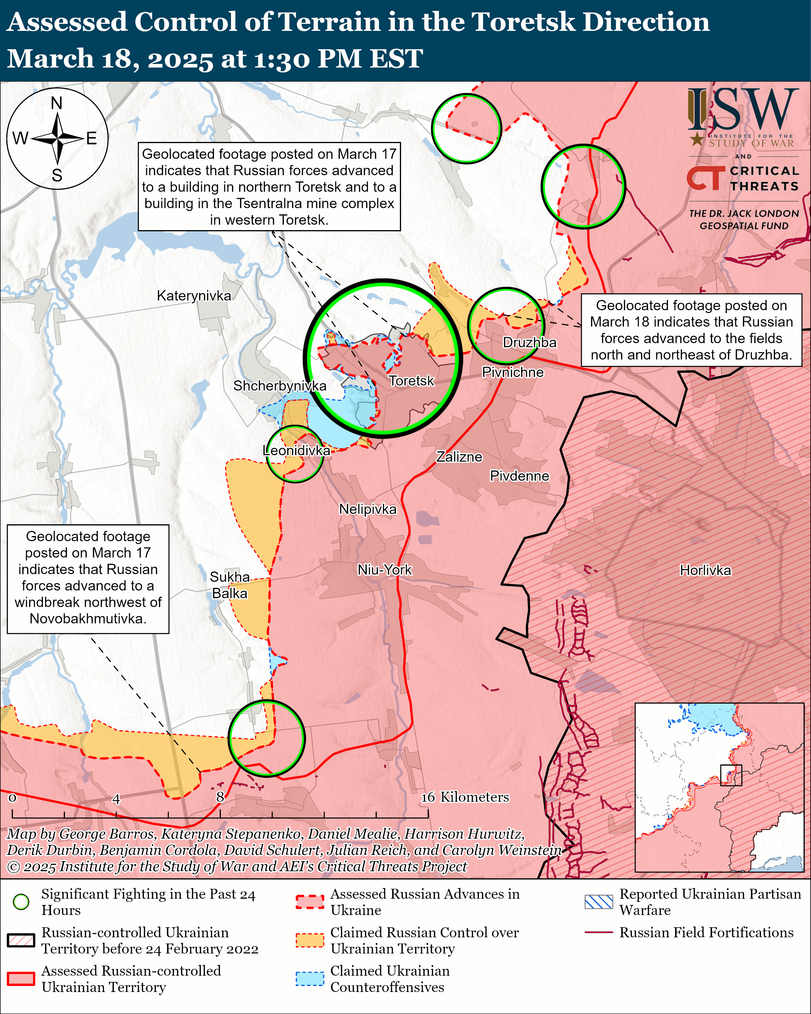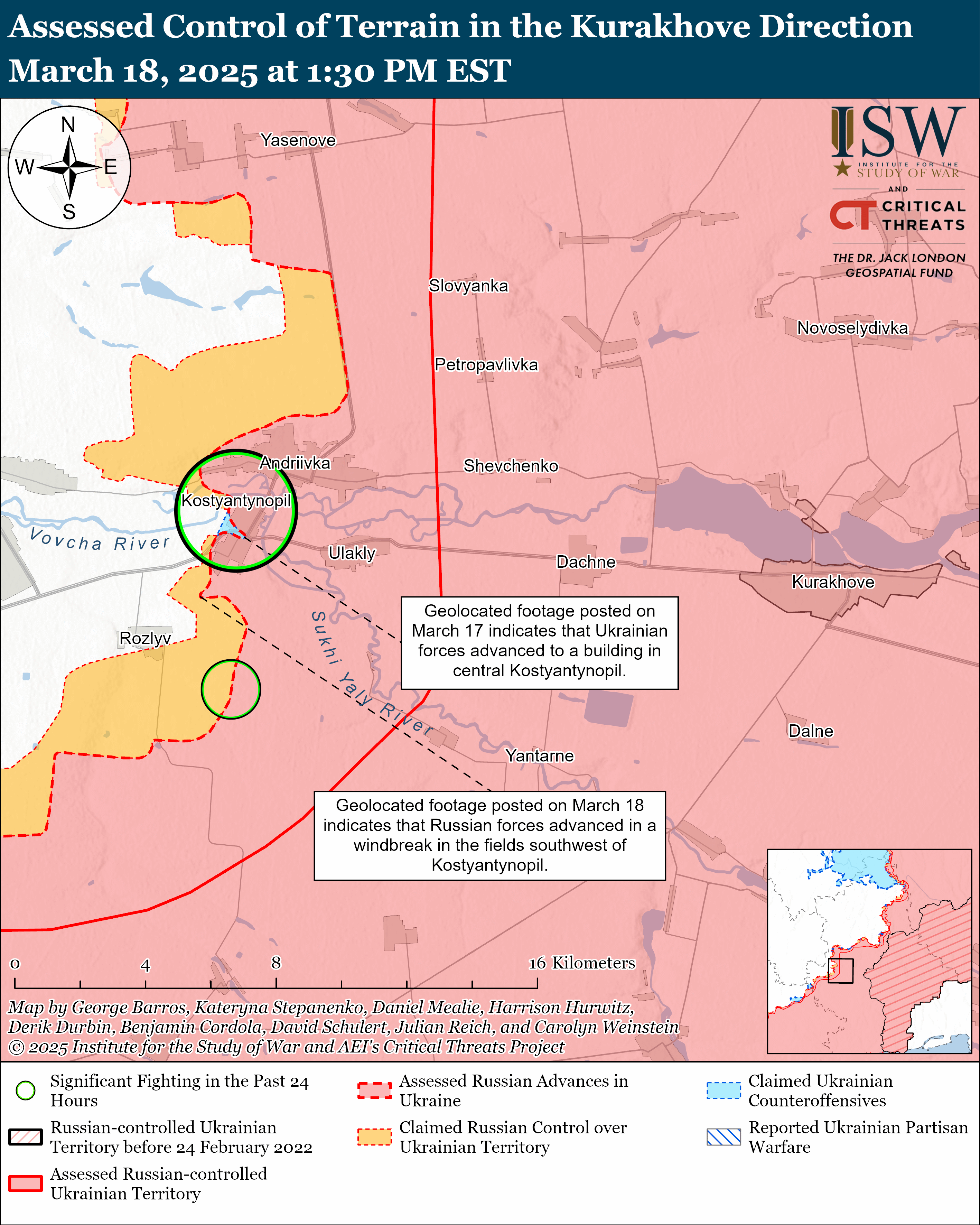 - На Покровському напрямку в окупантів успіхів не було, а от на Курахівському успіхи мали обидві армії. Геолокаційні кадри за 17 березня показують, що ЗСУ просунулися в центр Костянтинополя на захід від Курахового, а російські – на південний захід від Костянтинополя.