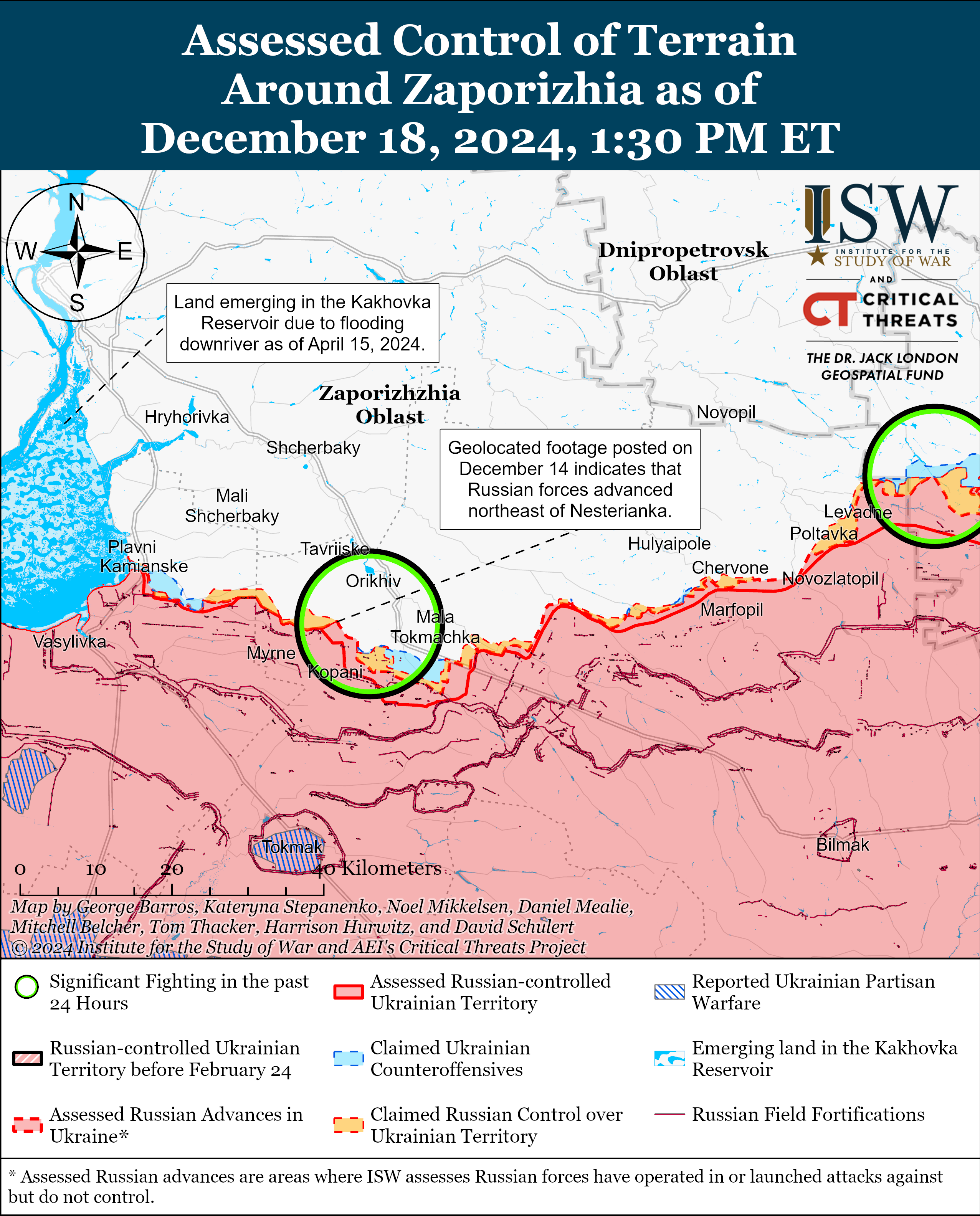 - Українські та російські сили просунулися поблизу Торецька. Геолокаційні кадри показують, що ЗСУ відновили втрачені позиції в Щербинівці на захід від Торецька, а російські сили незначно пройшли на захід від Неліпівки на південь від Торецька.