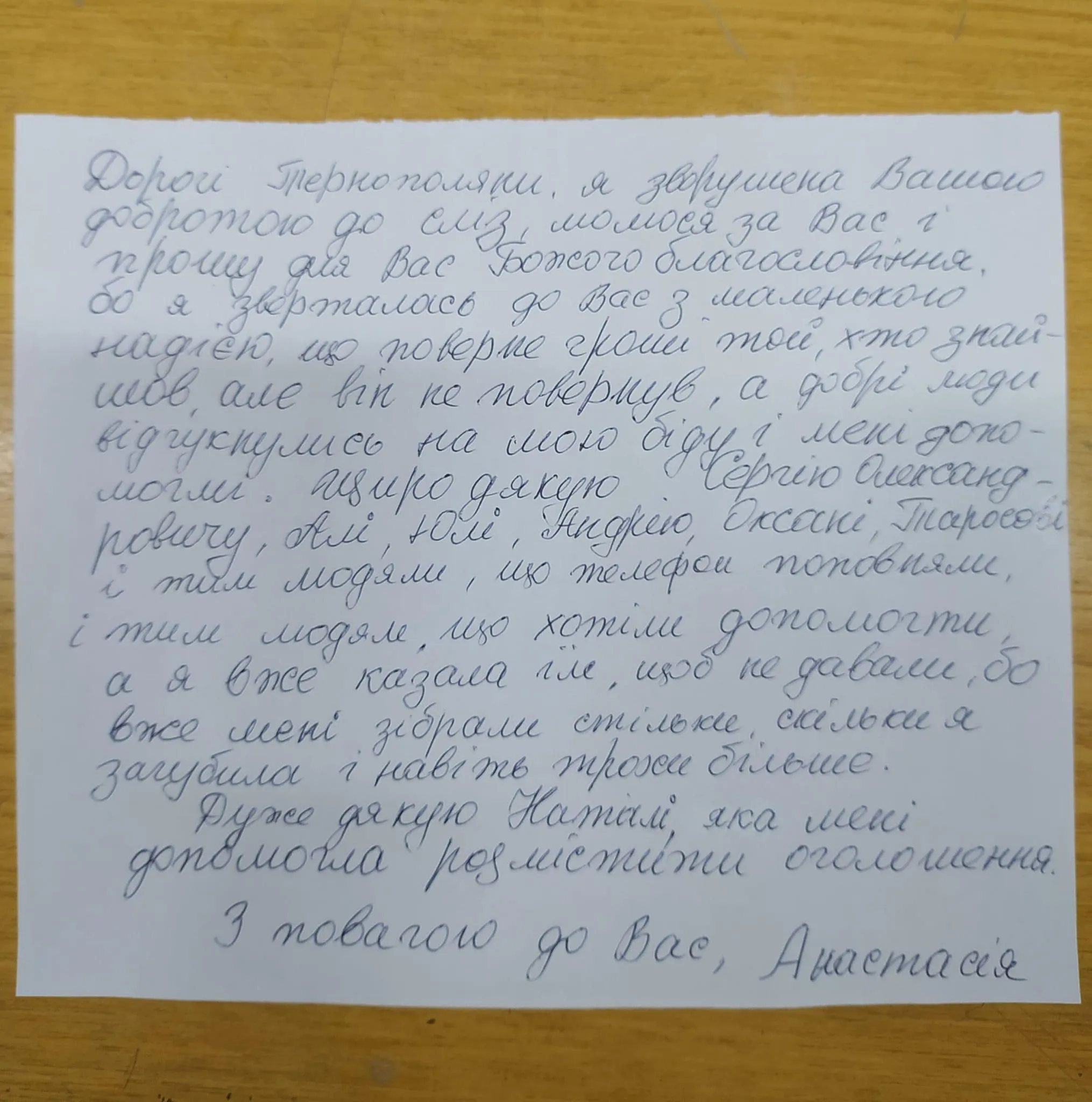 Лист-подяка жінки за небайдужість / Фото "Тернополяни"