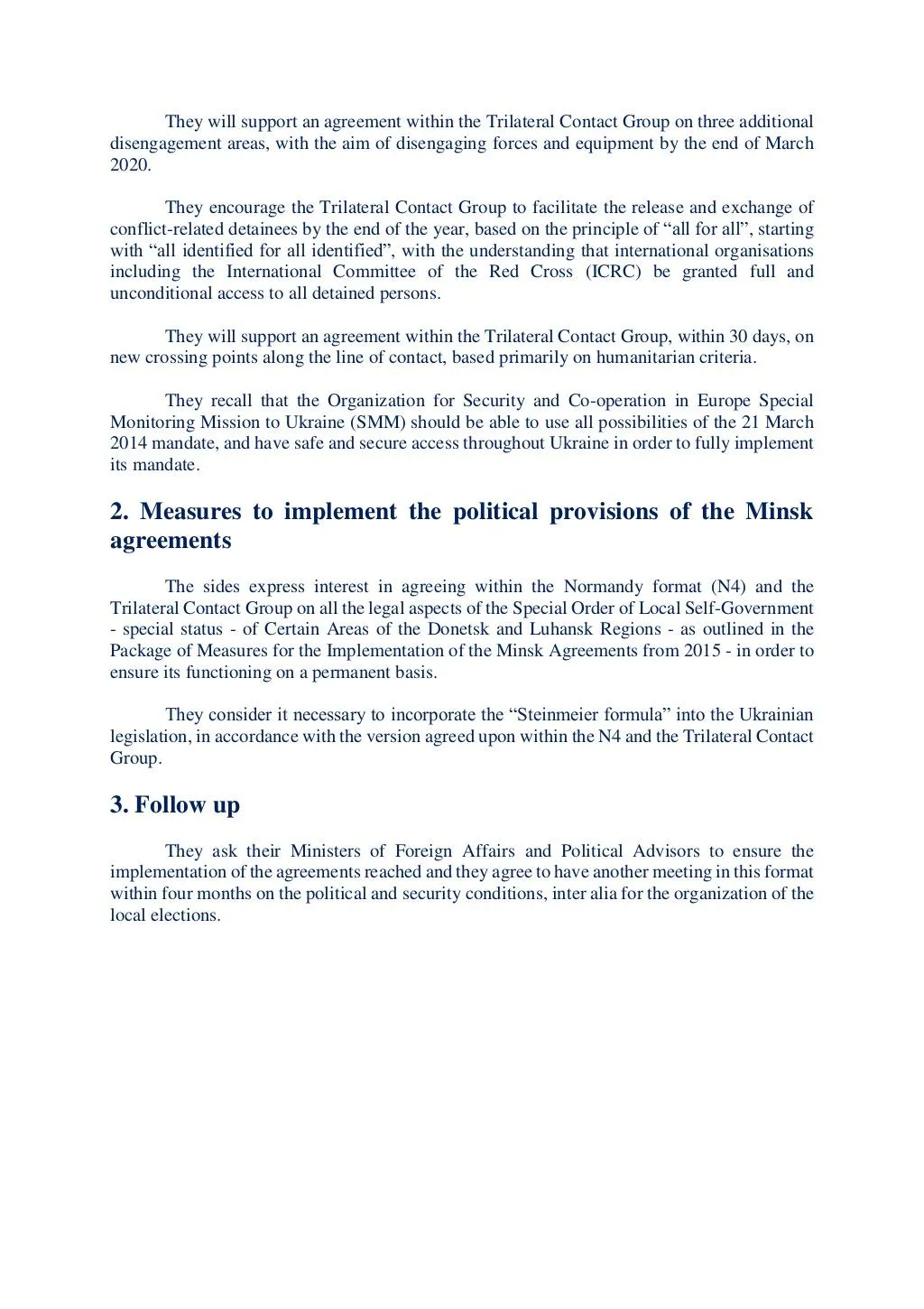 Другий пункт документа стосується імплементації політичної частини Мінських домовленостей. Сторони "вважають за необхідне включити формулу Штайнмаєра в законодавство України відповідно до її версії, погодженої "нормандською четвіркою" та Тристоронньою контактною групою".